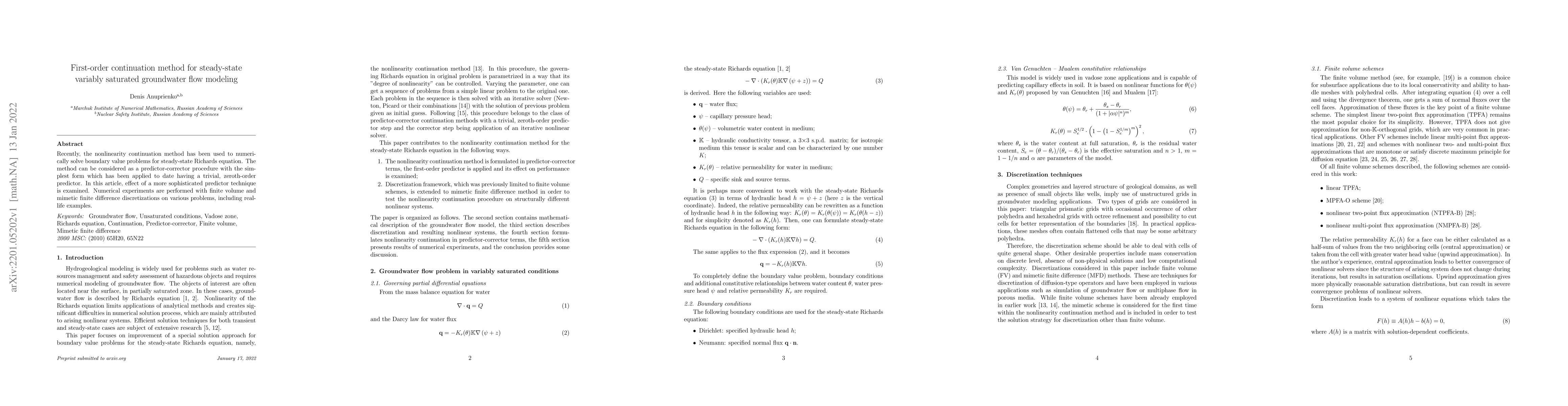 This paper introduces a first-order continuation method to solve the steady-state Richards equation for variably saturated groundwater flow, improving upon zeroth-order predictors with a more sophisticated predictor technique. Numerical experiments demonstrate its effectiveness using finite volume and mimetic finite difference discretizations on various problems, including real-life scenarios.
