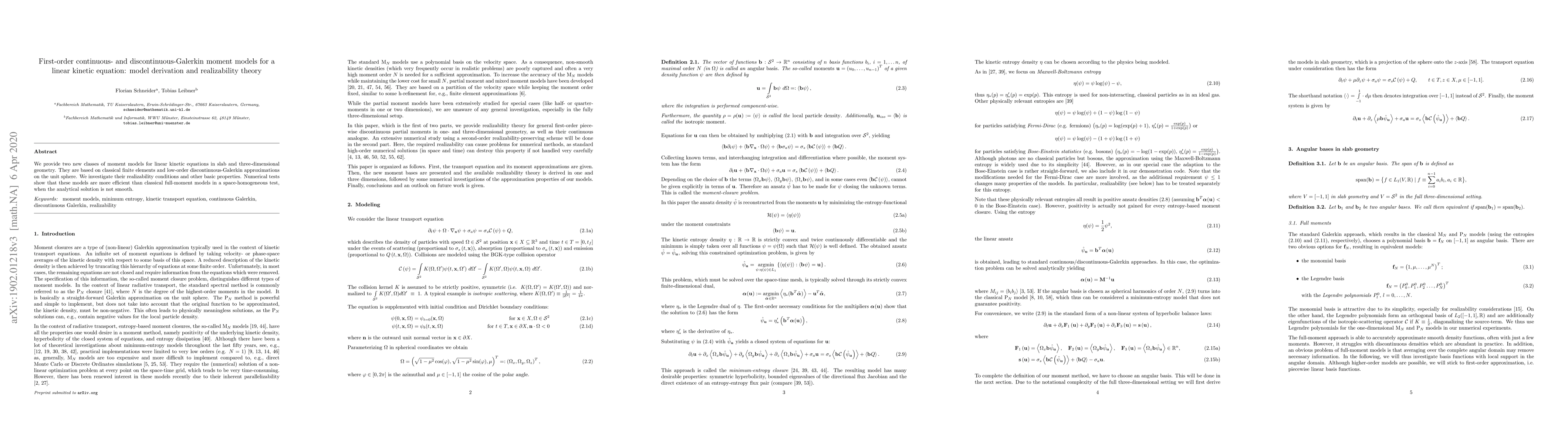We provide two new classes of moment models for linear kinetic equations in slab and three-dimensional geometry. They are based on classical finite elements and low-order discontinuous-Galerkin approximations on the unit sphere. We investigate their realizability conditions and other basic properties. Numerical tests show that these models are more efficient than classical full-moment models in a space-homogeneous test, when the analytical solution is not smooth.
