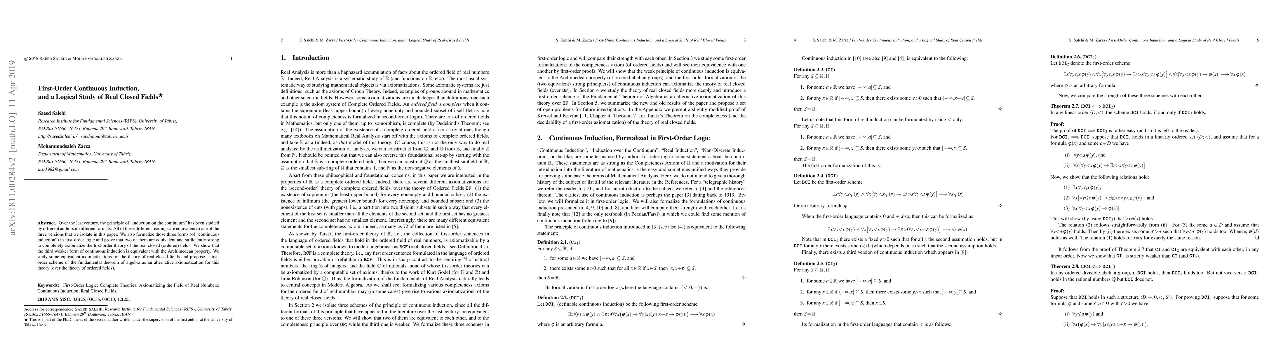 Over the last century, the principle of "induction on the continuum" has been studied by different authors in different formats. All of these different readings are equivalent to one of the three versions that we isolate in this paper. We also formalize those three forms (of "continuous induction") in first-order logic and prove that two of them are equivalent and sufficiently strong to completely axiomatize the first-order theory of the real closed (ordered) fields. We show that the third weaker form of continuous induction is equivalent with the Archimedean property. We study some equivalent axiomatizations for the theory of real closed fields and propose a first-order scheme of the fundamental theorem of algebra as an alternative axiomatization for this theory (over the theory of ordered fields).
