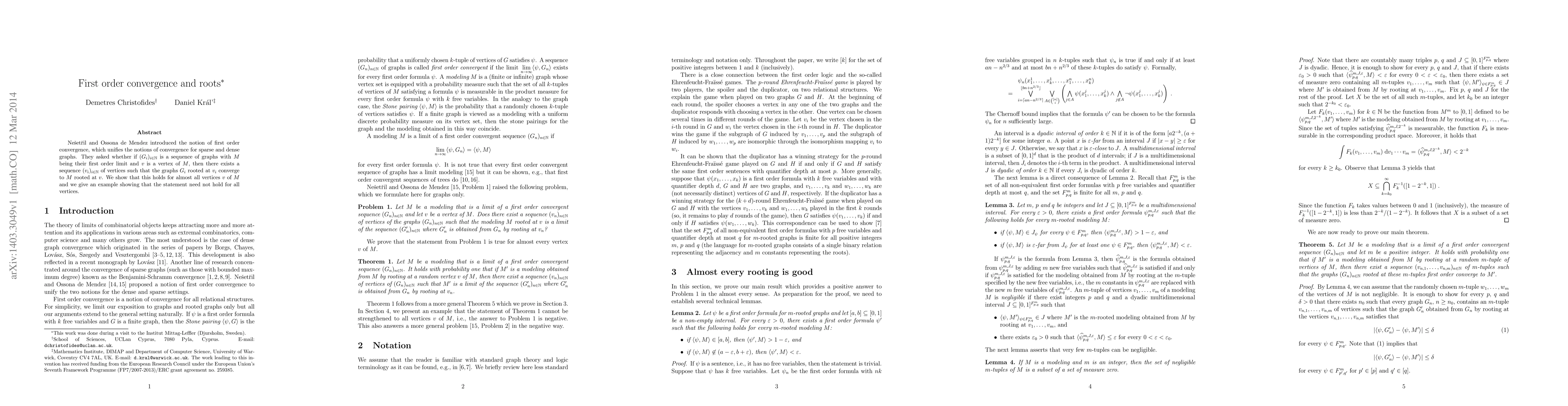 Nesetril and Ossona de Mendez introduced the notion of first order convergence, which unifies the notions of convergence for sparse and dense graphs. They asked whether if G_i is a sequence of graphs with M being their first order limit and v is a vertex of M, then there exists a sequence v_i of vertices such that the graphs G_i rooted at v_i converge to M rooted at v. We show that this holds for almost all vertices v of M and we give an example showing that the statement need not hold for all vertices.