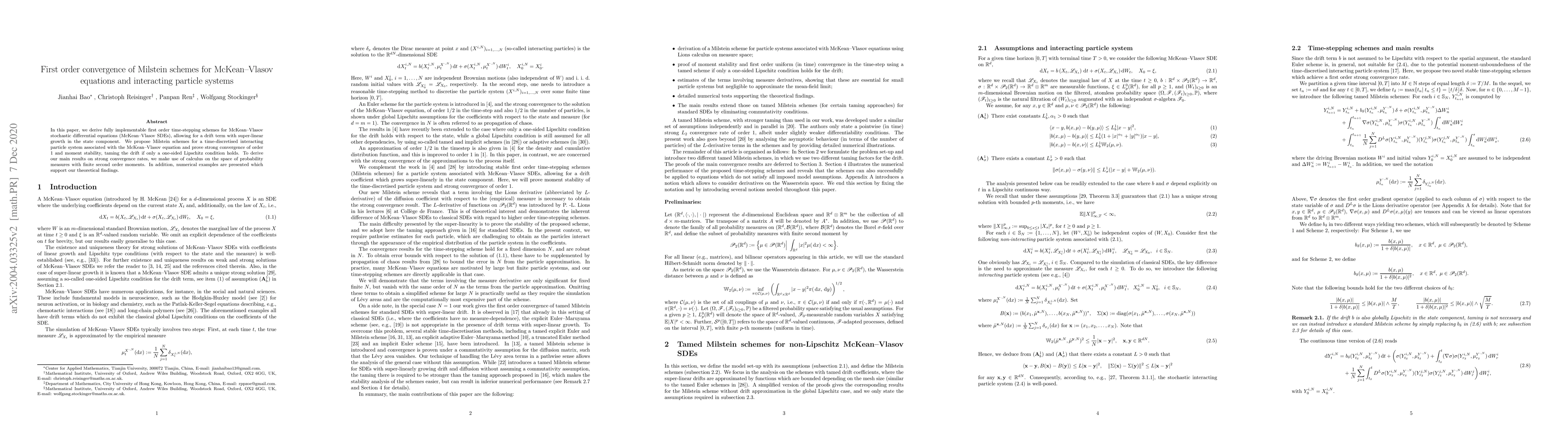This paper develops first-order Milstein schemes for McKean-Vlasov stochastic differential equations, proving strong convergence of order 1 and moment stability under one-sided Lipschitz conditions, and supports the theoretical results with numerical examples.