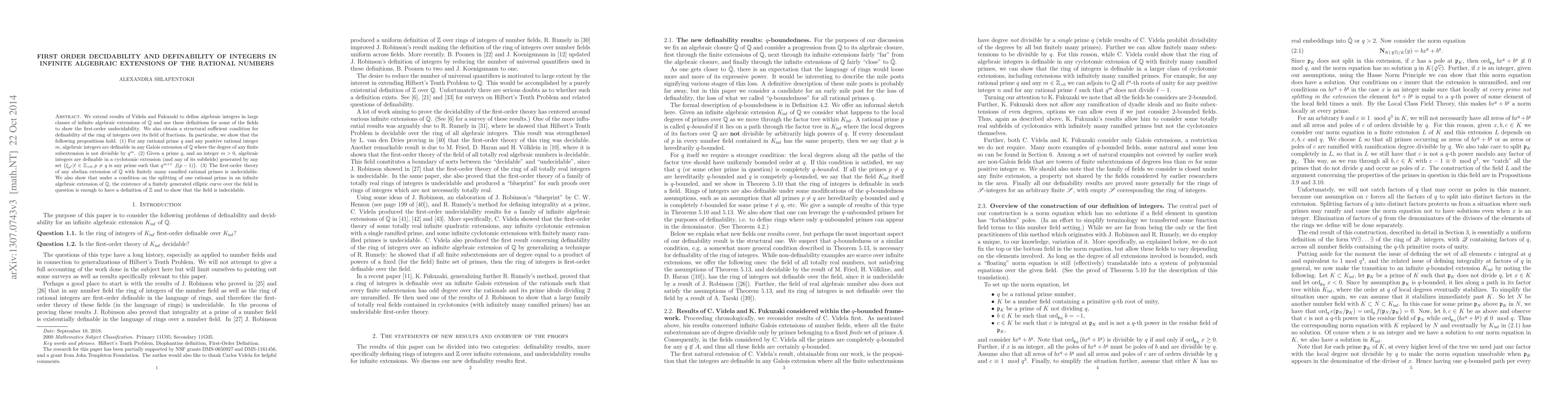 This paper extends previous results to define algebraic integers in various infinite algebraic extensions of rational numbers and demonstrates first-order undecidability in some cases. It provides conditions under which algebraic integers are definable and proves the undecidability of the first-order theory for certain abelian extensions.