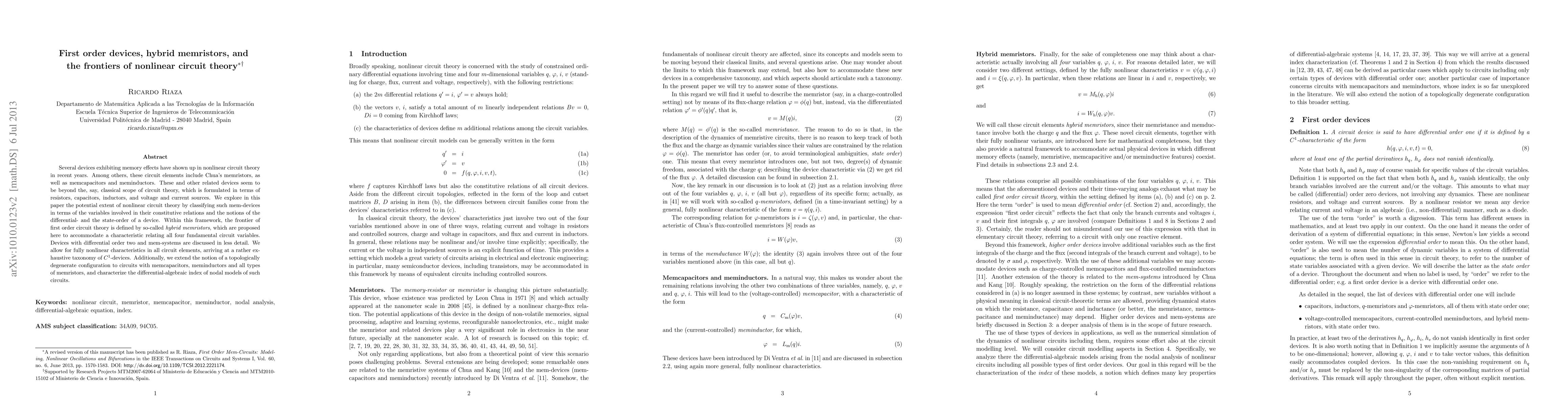 Several devices exhibiting memory effects have shown up in nonlinear circuit theory in recent years. Among others, these circuit elements include Chua's memristors, as well as memcapacitors and meminductors. These and other related devices seem to be beyond the, say, classical scope of circuit theory, which is formulated in terms of resistors, capacitors, inductors, and voltage and current sources. We explore in this paper the potential extent of nonlinear circuit theory by classifying such mem-devices in terms of the variables involved in their constitutive relations and the notions of the differential- and the state-order of a device. Within this framework, the frontier of first order circuit theory is defined by so-called hybrid memristors, which are proposed here to accommodate a characteristic relating all four fundamental circuit variables. Devices with differential order two and mem-systems are discussed in less detail. We allow for fully nonlinear characteristics in all circuit elements, arriving at a rather exhaustive taxonomy of C^1-devices. Additionally, we extend the notion of a topologically degenerate configuration to circuits with memcapacitors, meminductors and all types of memristors, and characterize the differential-algebraic index of nodal models of such circuits.