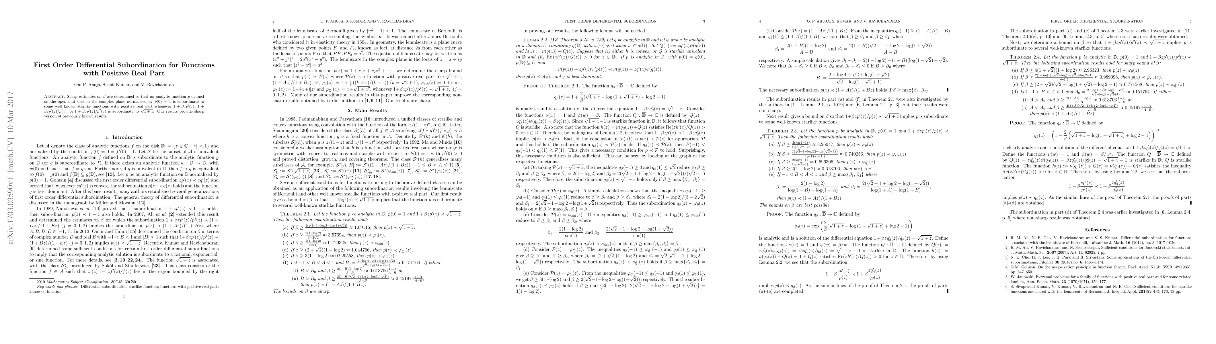 Sharp estimates on $\beta$ are determined so that an analytic function $p$ defined on the open unit disk in the complex plane normalized by $p(0)=1$ is subordinate to some well known starlike functions with positive real part whenever $1+\beta z p'(z), \,\,1+\beta z p'(z)/p(z), \,\,\mbox{or}\,\,1+\beta z p'(z)/p^{2}(z)$ is subordinate to $\sqrt{1+z}$. Our results provide sharp version of previously known results.