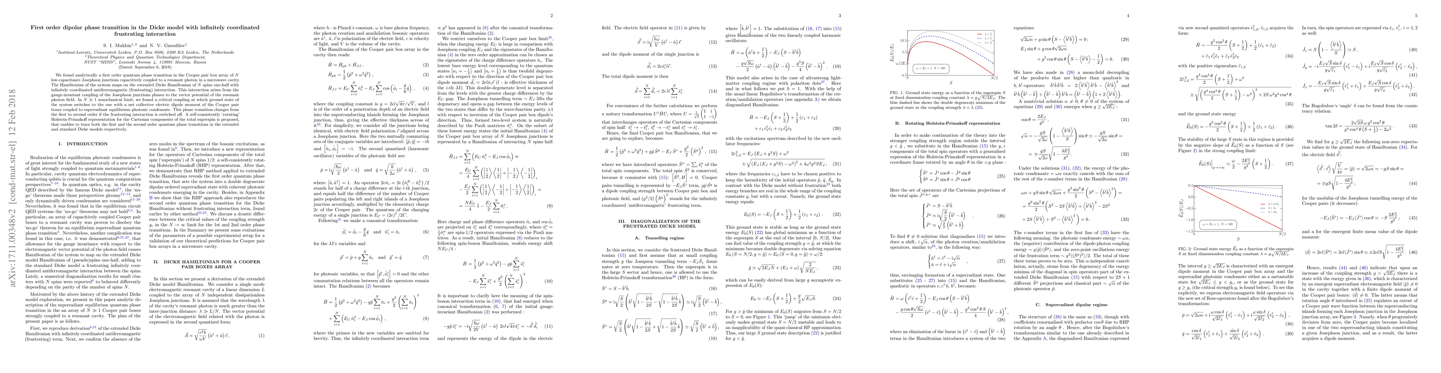 We found analytically a first order quantum phase transition in the Cooper pair box array of $N$ low-capacitance Josephson junctions capacitively coupled to a resonant photon in a microwave cavity. The Hamiltonian of the system maps on the extended Dicke Hamiltonian of $N$ spins one-half with infinitely coordinated antiferromagnetic (frustrating) interaction. This interaction arises from the gauge-invariant coupling of the Josephson junctions phases to the vector potential of the resonant photon field. In $N \gg 1$ semiclassical limit, we found a critical coupling at which ground state of the system switches to the one with a net collective electric dipole moment of the Cooper pair boxes coupled to superradiant equilibrium photonic condensate. This phase transition changes from the first to second order if the frustrating interaction is switched off. A self-consistently `rotating' Holstein-Primakoff representation for the Cartesian components of the total superspin is proposed, that enables to trace both the first and the second order quantum phase transitions in the extended and standard Dicke models respectively.
