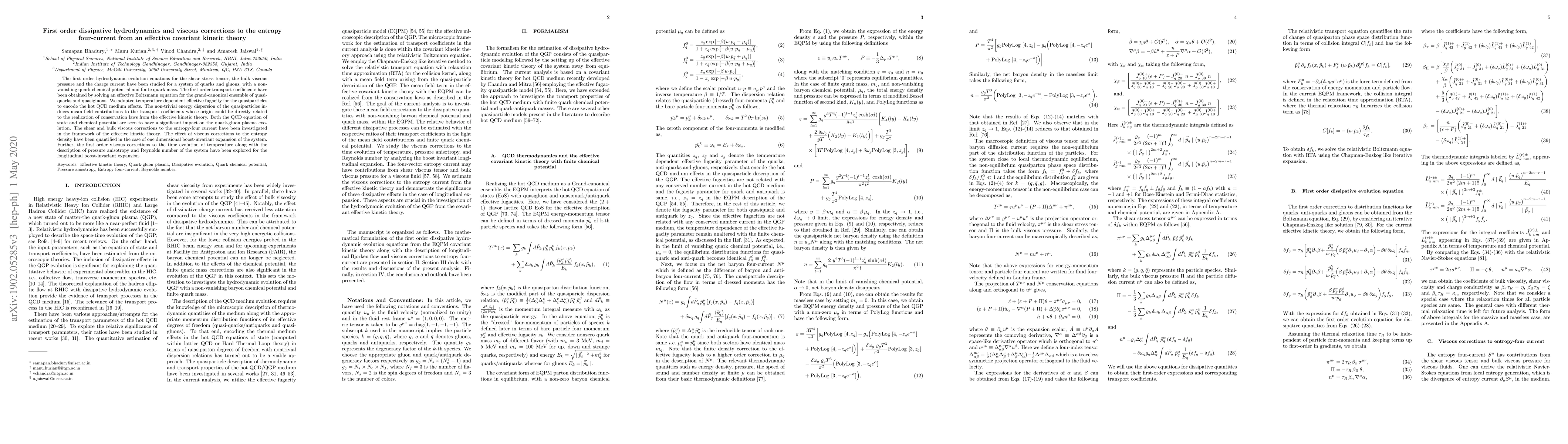 The first order hydrodynamic evolution equations for the shear stress tensor, the bulk viscous pressure and the charge current have been studied for a system of quarks and gluons, with a non-vanishing quark chemical potential and finite quark mass. The first order transport coefficients have been obtained by solving an effective Boltzmann equation for the grand-canonical ensemble of quasiquarks and quasigluons. We adopted temperature dependent effective fugacity for the quasiparticles to encode the hot QCD medium effects. The non-trivial energy dispersion of the quasiparticles induces mean field contributions to the transport coefficients whose origin could be directly related to the realization of conservation laws from the effective kinetic theory. Both the QCD equation of state and chemical potential are seen to have a significant impact on the quark-gluon plasma evolution. The shear and bulk viscous corrections to the entropy-four current have been investigated in the framework of the effective kinetic theory. The effect of viscous corrections to the entropy density have been quantified in the case of one dimensional boost-invariant expansion of the system. Further, the first order viscous corrections to the time evolution of temperature along with the description of pressure anisotropy and Reynolds number of the system have been explored for the longitudinal boost-invariant expansion.volution of temperature along with the description of pressure anisotropy of the system have also been explored.