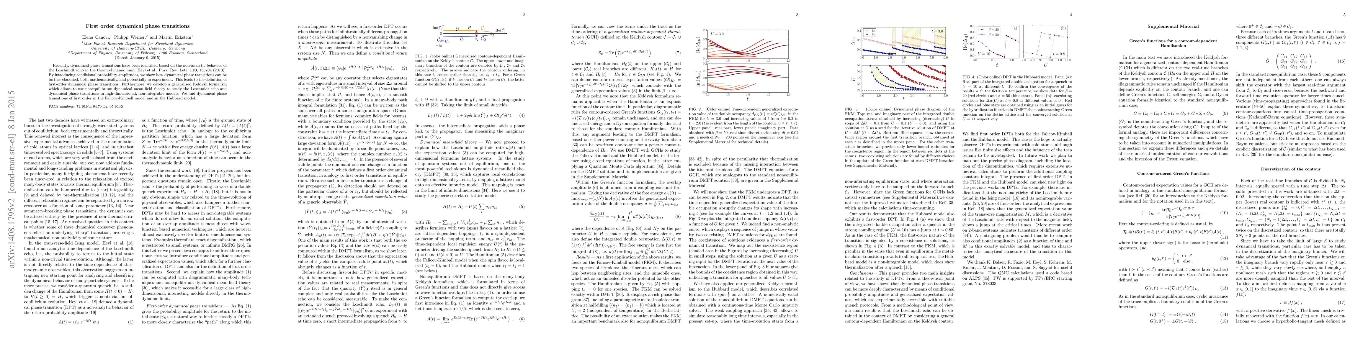 Recently, dynamical phase transitions have been identified based on the non-analytic behavior of the Loschmidt echo in the thermodynamic limit [Heyl et al., Phys.~Rev.~Lett.~{\bf 110}, 135704 (2013)]. By introducing conditional probability amplitudes, we show how dynamical phase transitions can be further classified, both mathematically, and potentially in experiment. This leads to the definition of first-order dynamical phase transitions. Furthermore, we develop a generalized Keldysh formalism which allows to use nonequilibrium dynamical mean-field theory to study the Loschmidt echo and dynamical phase transitions in high-dimensional, non-integrable models. We find dynamical phase transitions of first order in the Falicov-Kimball model and in the Hubbard model.