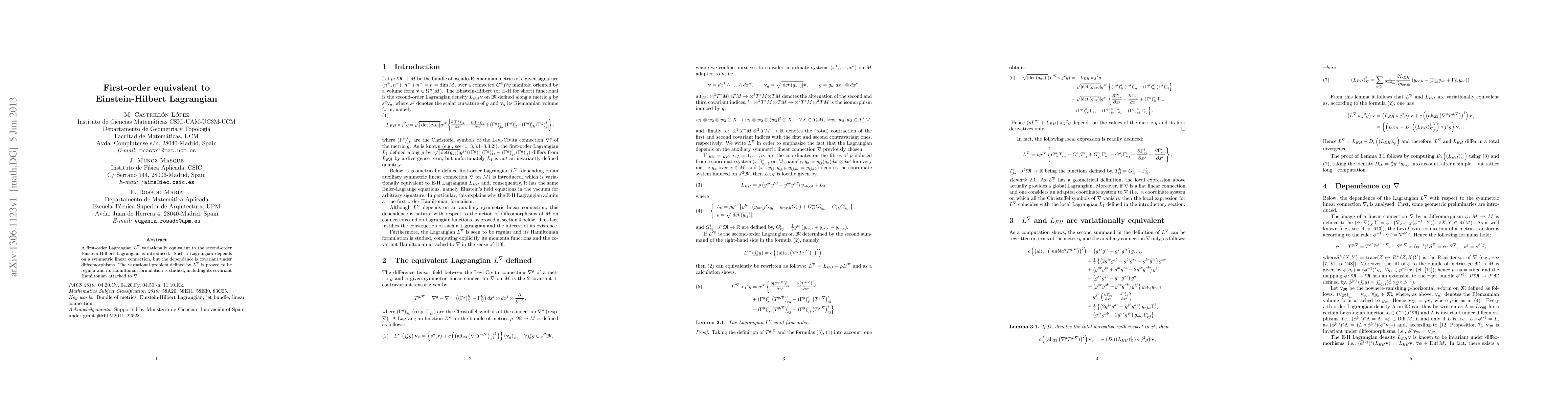 This paper introduces a first-order Lagrangian $L^\nabla $ that is variationally equivalent to the second-order Einstein-Hilbert Lagrangian, relying on a symmetric linear connection and maintaining covariance under diffeomorphisms. The study also proves the regularity of the variational problem and explores its Hamiltonian formulation.