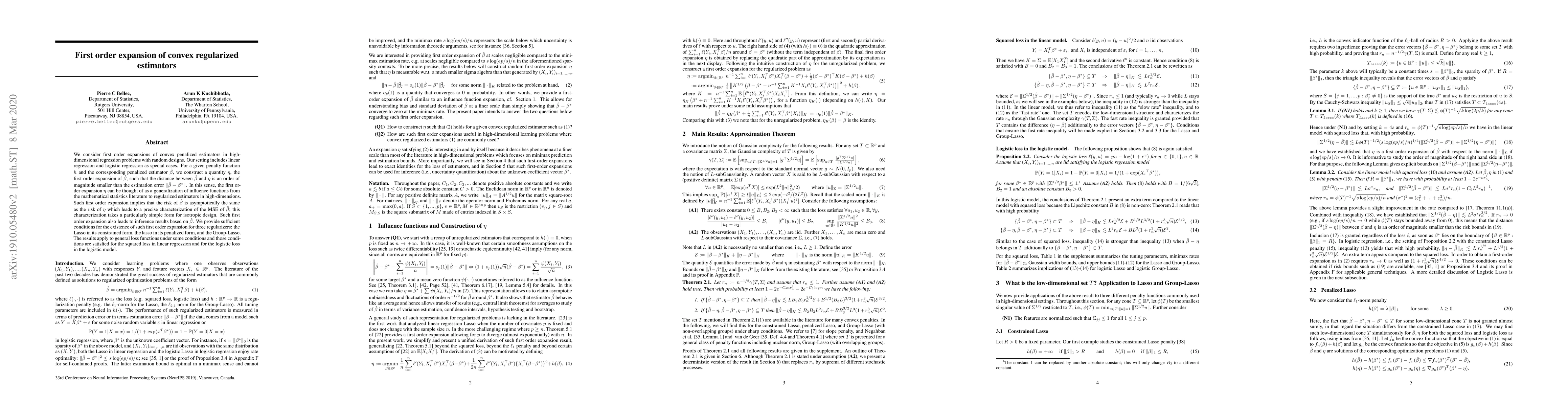 This paper develops first order expansions for convex penalized estimators in high-dimensional regression, showing that these expansions provide a precise characterization of the mean squared error (MSE) of the estimators. The expansions generalize influence functions and apply to Lasso and Group-Lasso regularizers, with results demonstrated for linear and logistic regression.