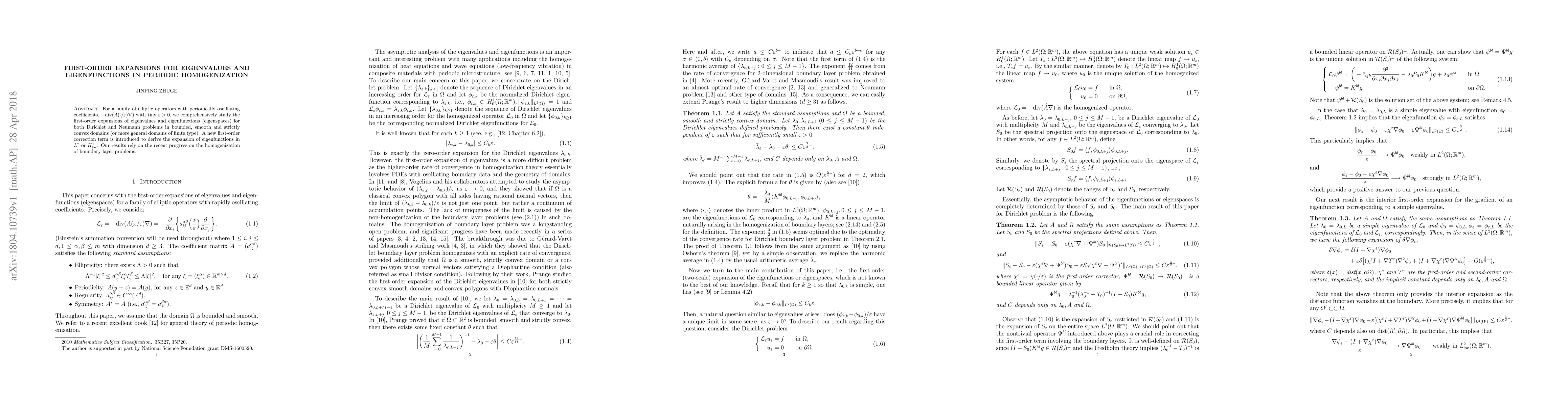 For a family of elliptic operators with periodically oscillating coefficients, $-\text{div}( A(\cdot/\varepsilon) \nabla) $ with tiny $\varepsilon>0$, we comprehensively study the first-order expansions of eigenvalues and eigenfunctions (eigenspaces) for both Dirichlet and Neumann problems in bounded, smooth and strictly convex domains (or more general domains of finite type). A new first-order correction term is introduced to derive the expansion of eigenfunctions in $L^2$ or $H^1_{\text{loc}}$. Our results rely on the recent progress on the homogenization of boundary layer problems.