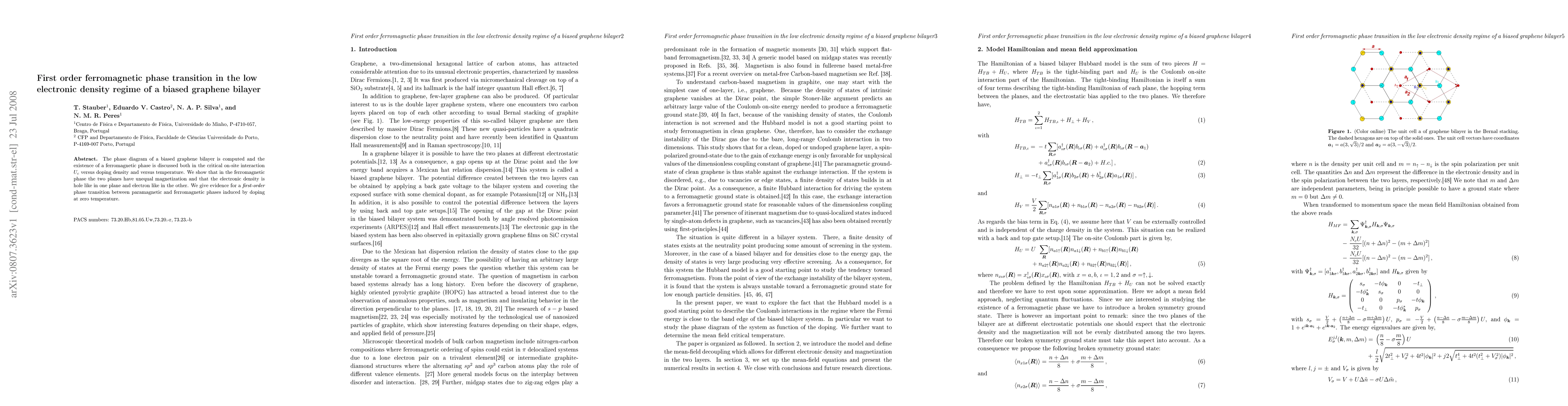 The phase diagram of a biased graphene bilayer is computed and the existence of a ferromagnetic phase is discussed both in the critical on-site interaction $U_{c}$ versus doping density and versus temperature. We show that in the ferromagnetic phase the two planes have unequal magnetization and that the electronic density is hole like in one plane and electron like in the other. We give evidence for a \emph{first-order} phase transition between paramagnetic and ferromagnetic phases induced by doping at zero temperature.