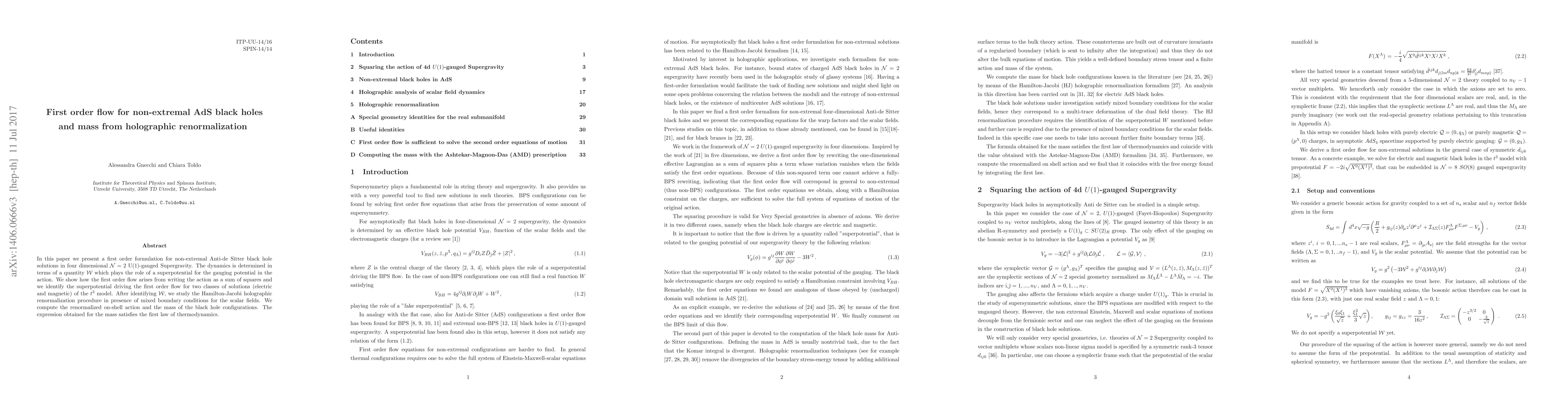 In this paper we present a first order formulation for non-extremal Anti-de Sitter black hole solutions in four dimensional $\mathcal{N}=2$ U(1)-gauged Supergravity. The dynamics is determined in terms of a quantity $\mathcal{W}$ which plays the role of a superpotential for the gauging potential in the action. We show how the first order flow arises from writing the action as a sum of squares and we identify the superpotential driving the first order flow for two classes of solutions (electric and magnetic) of the $t^3$ model. After identifying $\mathcal{W}$, we study the Hamilton-Jacobi holographic renormalization procedure in presence of mixed boundary conditions for the scalar fields. We compute the renormalized on-shell action and the mass of the black hole configurations. The expression obtained for the mass satisfies the first law of thermodynamics.