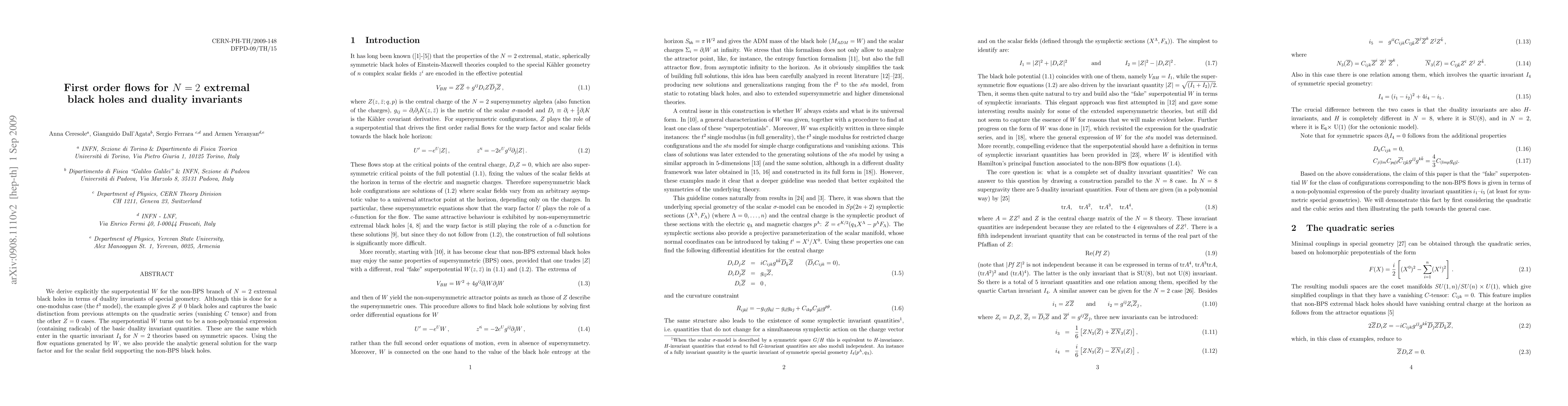 We derive explicitly the superpotential W for the non-BPS branch of N=2 extremal black holes in terms of duality invariants of special geometry. Although this is done for a one-modulus case (the t^3 model), the example gives $Z \neq 0$ black holes and captures the basic distinction from previous attempts on the quadratic series (vanishing C tensor) and from the other Z=0 cases. The superpotential W turns out to be a non-polynomial expression (containing radicals) of the basic duality invariant quantities. These are the same which enter in the quartic invariant I_4 for N=2 theories based on symmetric spaces. Using the flow equations generated by W, we also provide the analytic general solution for the warp factor and for the scalar field supporting the non-BPS black holes.