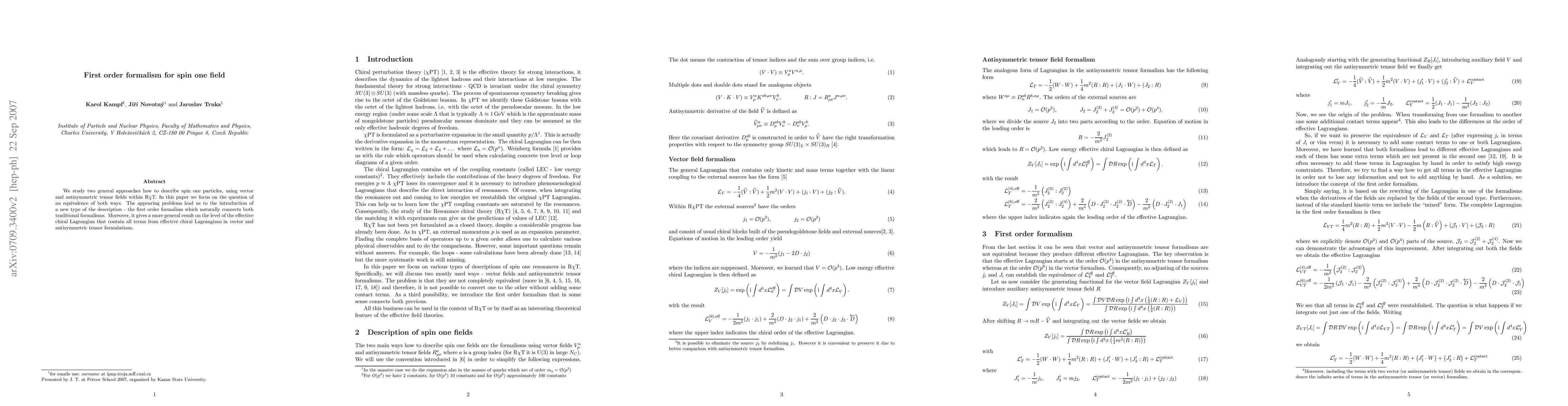 We study two general approaches how to describe spin one particles, using vector and antisymmetric tensor fields within RChT. In this paper we focus on the question of an equivalence of both ways. The appearing problems lead us to the introduction of a new type of the description - the first order formalism which naturally connects both traditional formalisms. Moreover, it gives a more general result on the level of the effective chiral Lagrangian that contain all terms from effective chiral Lagrangians in vector and antisymmetric tensor formulations.