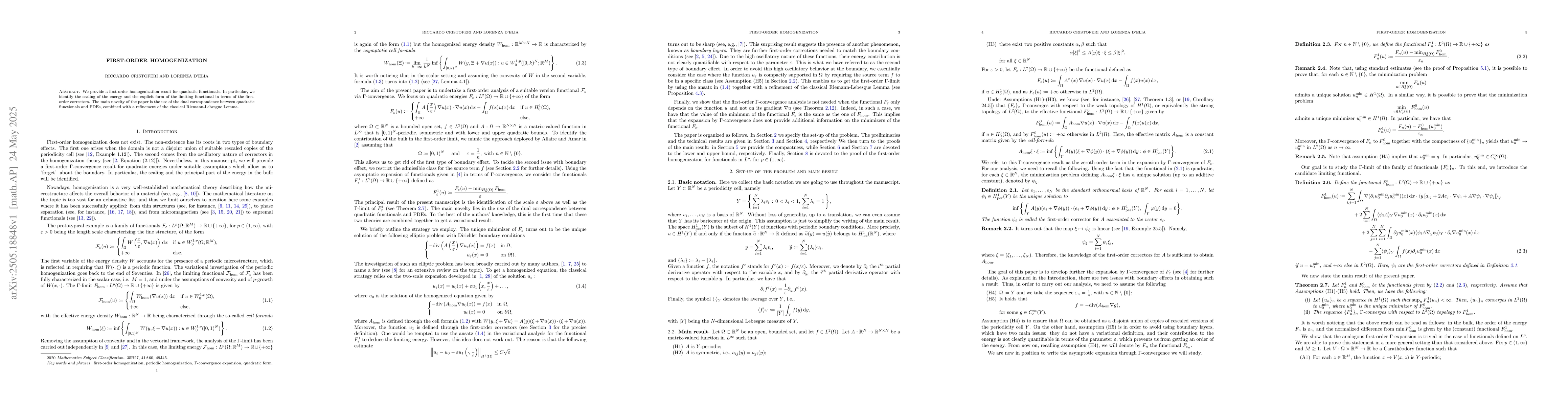 We provide a first-order homogenization result for quadratic functionals. In particular, we identify the scaling of the energy and the explicit form of the limiting functional in terms of the first-order correctors. The main novelty of the paper is the use of the dual correspondence between quadratic functionals and PDEs, combined with a refinement of the classical Riemann-Lebesgue Lemma.
