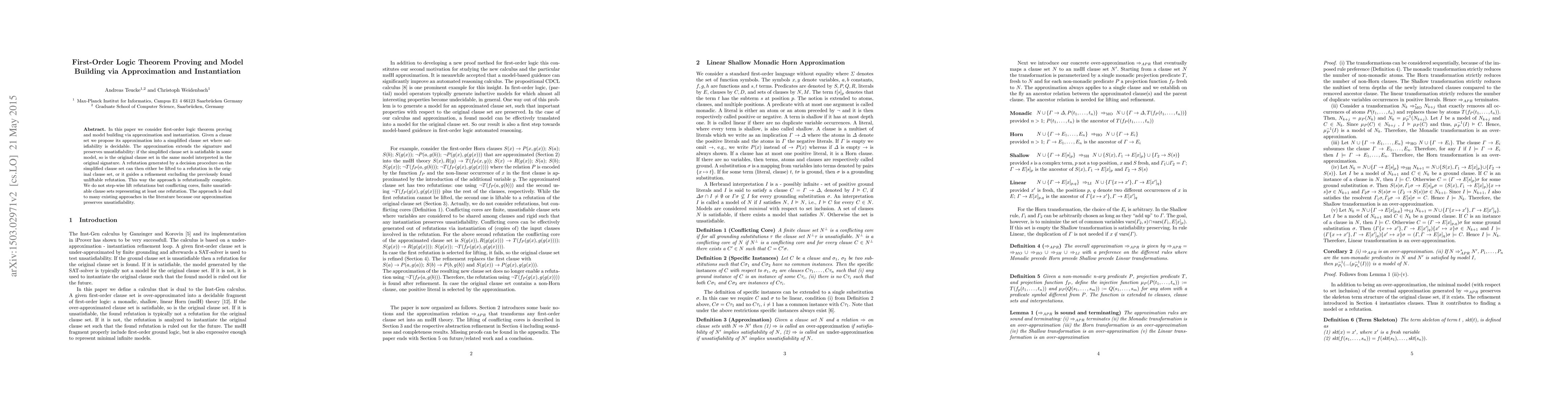 In this paper we consider first-order logic theorem proving and model building via approximation and instantiation. Given a clause set we propose its approximation into a simplified clause set where satisfiability is decidable. The approximation extends the signature and preserves unsatisfiability: if the simplified clause set is satisfiable in some model, so is the original clause set in the same model interpreted in the original signature. A refutation generated by a decision procedure on the simplified clause set can then either be lifted to a refutation in the original clause set, or it guides a refinement excluding the previously found unliftable refutation. This way the approach is refutationally complete. We do not step-wise lift refutations but conflicting cores, finite unsatisfiable clause sets representing at least one refutation. The approach is dual to many existing approaches in the literature because our approximation preserves unsatisfiability.