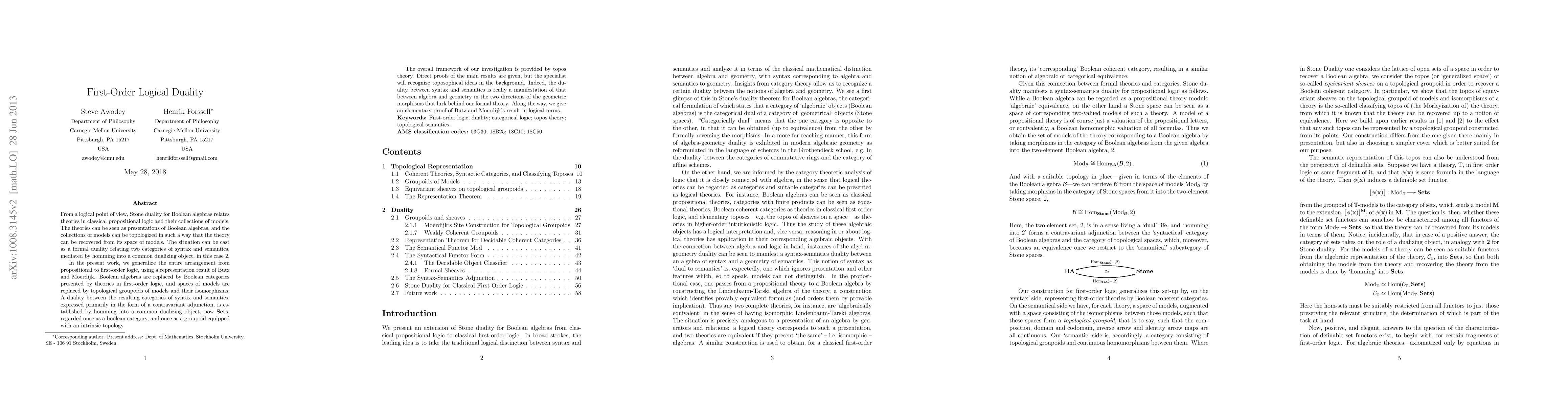 Researchers develop a duality framework for first-order logical theories, relating syntax and semantics through a common dualizing object, and establish a contravariant adjunction between two categories of syntax and semantics in topos theory.