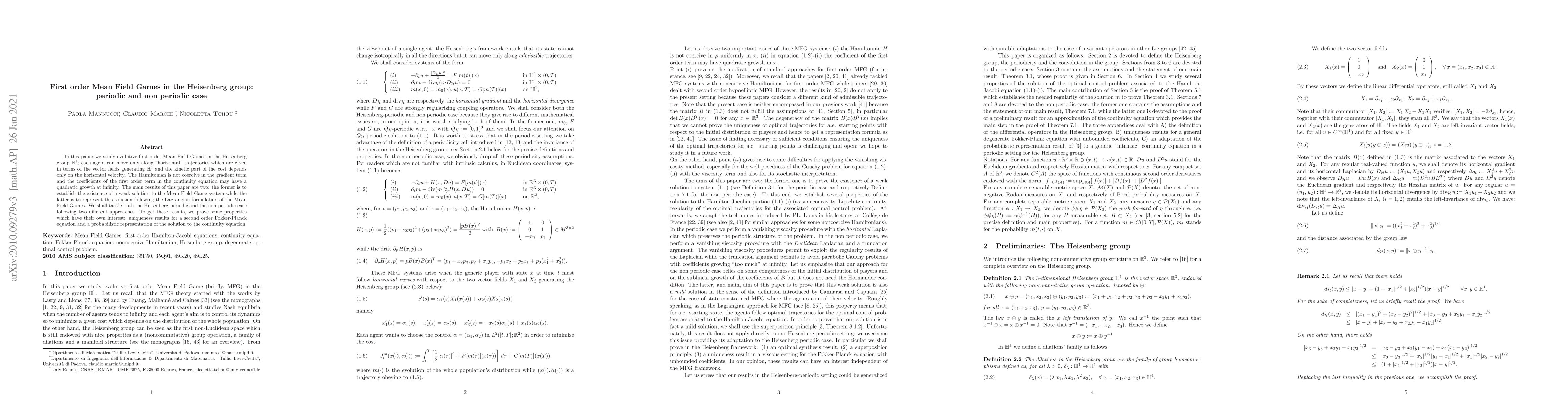 This paper establishes the existence of a weak solution to Mean Field Games in the Heisenberg group for both periodic and non-periodic cases, and represents this solution using Lagrangian formulation.