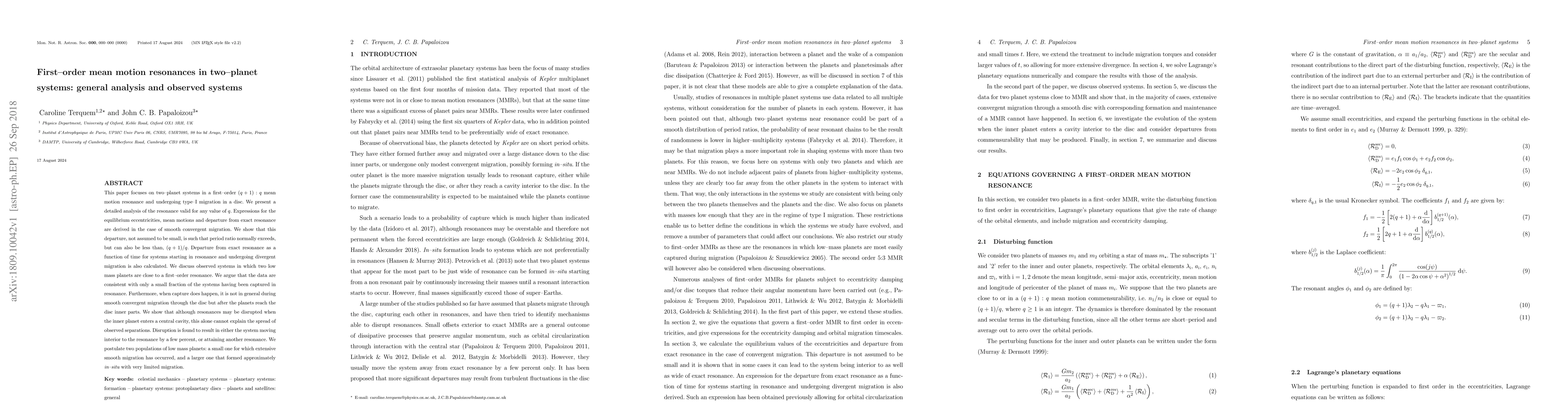 This paper focuses on two-planet systems in a first-order $(q+1):q$ mean motion resonance and undergoing type-I migration in a disc. We present a detailed analysis of the resonance valid for any value of $q$. Expressions for the equilibrium eccentricities, mean motions and departure from exact resonance are derived in the case of smooth convergent migration. We show that this departure, not assumed to be small, is such that period ratio normally exceeds, but can also be less than, $ (q+1)/q.$ Departure from exact resonance as a function of time for systems starting in resonance and undergoing divergent migration is also calculated. We discuss observed systems in which two low mass planets are close to a first-order resonance. We argue that the data are consistent with only a small fraction of the systems having been captured in resonance. Furthermore, when capture does happen, it is not in general during smooth convergent migration through the disc but after the planets reach the disc inner parts. We show that although resonances may be disrupted when the inner planet enters a central cavity, this alone cannot explain the spread of observed separations. Disruption is found to result in either the system moving interior to the resonance by a few percent, or attaining another resonance. We postulate two populations of low mass planets: a small one for which extensive smooth migration has occurred, and a larger one that formed approximately in-situ with very limited migration.