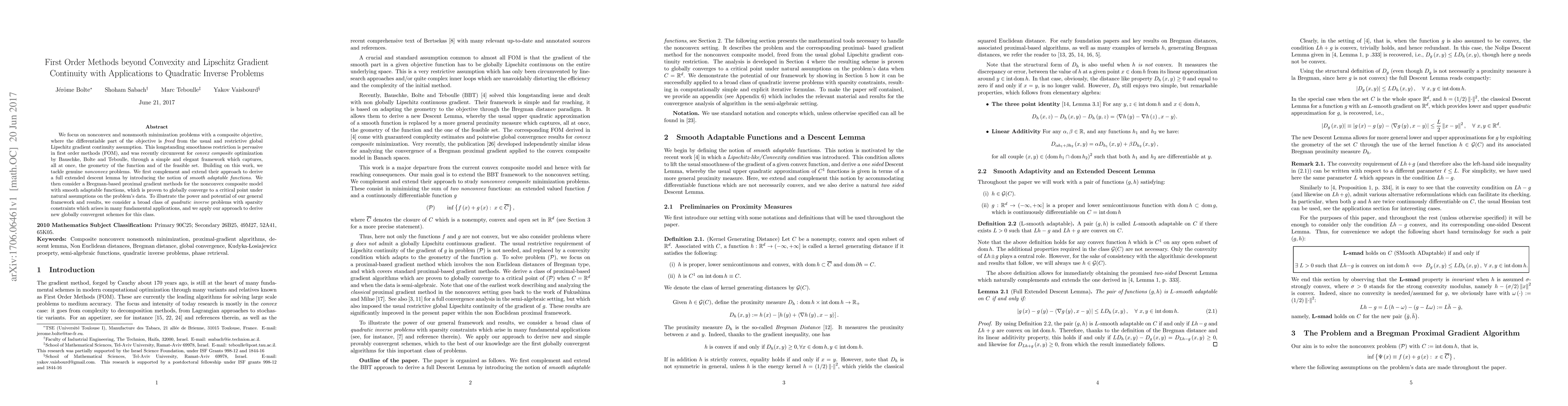 We focus on nonconvex and nonsmooth minimization problems with a composite objective, where the differentiable part of the objective is freed from the usual and restrictive global Lipschitz gradient continuity assumption. This longstanding smoothness restriction is pervasive in first order methods (FOM), and was recently circumvent for convex composite optimization by Bauschke, Bolte and Teboulle, through a simple and elegant framework which captures, all at once, the geometry of the function and of the feasible set. Building on this work, we tackle genuine nonconvex problems. We first complement and extend their approach to derive a full extended descent lemma by introducing the notion of smooth adaptable functions. We then consider a Bregman-based proximal gradient methods for the nonconvex composite model with smooth adaptable functions, which is proven to globally converge to a critical point under natural assumptions on the problem's data. To illustrate the power and potential of our general framework and results, we consider a broad class of quadratic inverse problems with sparsity constraints which arises in many fundamental applications, and we apply our approach to derive new globally convergent schemes for this class.