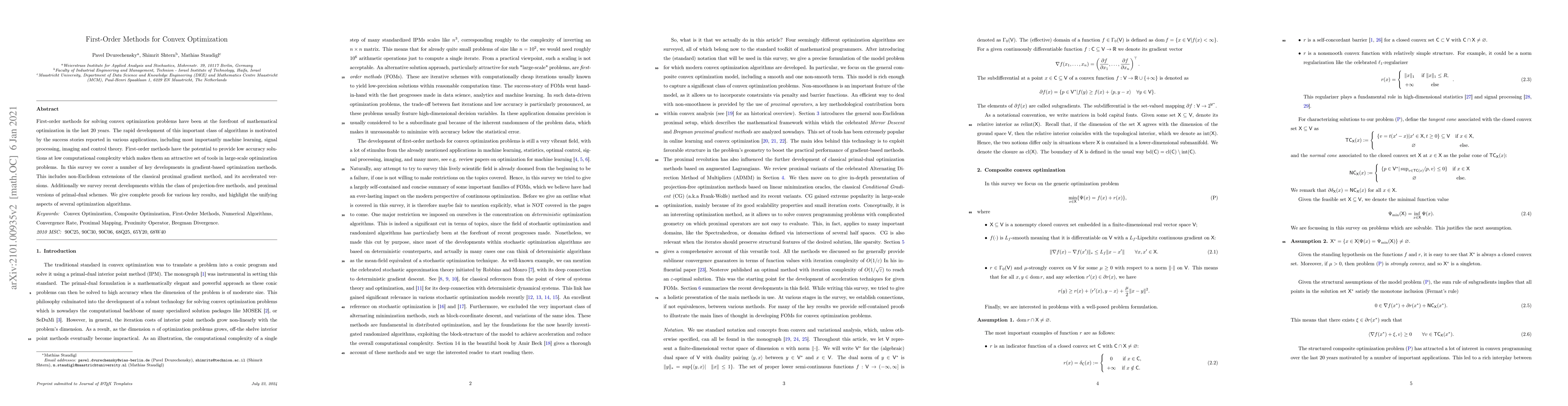 First-order methods for solving convex optimization problems have been at the forefront of mathematical optimization in the last 20 years. The rapid development of this important class of algorithms is motivated by the success stories reported in various applications, including most importantly machine learning, signal processing, imaging and control theory. First-order methods have the potential to provide low accuracy solutions at low computational complexity which makes them an attractive set of tools in large-scale optimization problems. In this survey we cover a number of key developments in gradient-based optimization methods. This includes non-Euclidean extensions of the classical proximal gradient method, and its accelerated versions. Additionally we survey recent developments within the class of projection-free methods, and proximal versions of primal-dual schemes. We give complete proofs for various key results, and highlight the unifying aspects of several optimization algorithms.