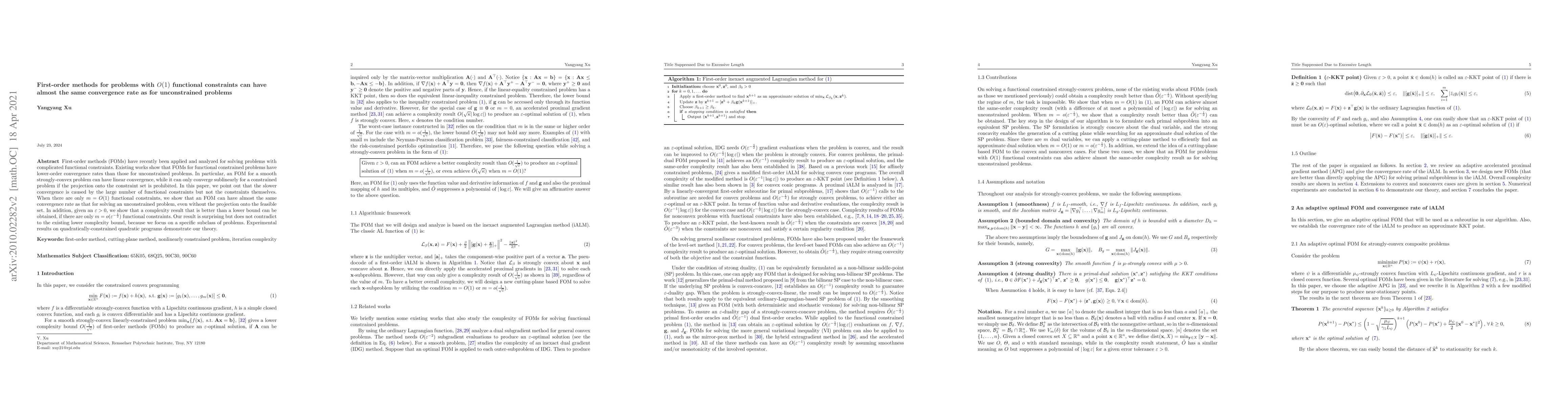 This research shows that first-order methods, when dealing with a small, constant number of functional constraints (O(1)), can achieve nearly the same convergence rate as unconstrained problems. Even without projecting onto the feasible set, these methods perform well. The study also reveals that with o(ε^(-1/2)) functional constraints, a better complexity result than the existing lower bound can be attained. These findings are supported by experiments on quadratically-constrained quadratic programs.