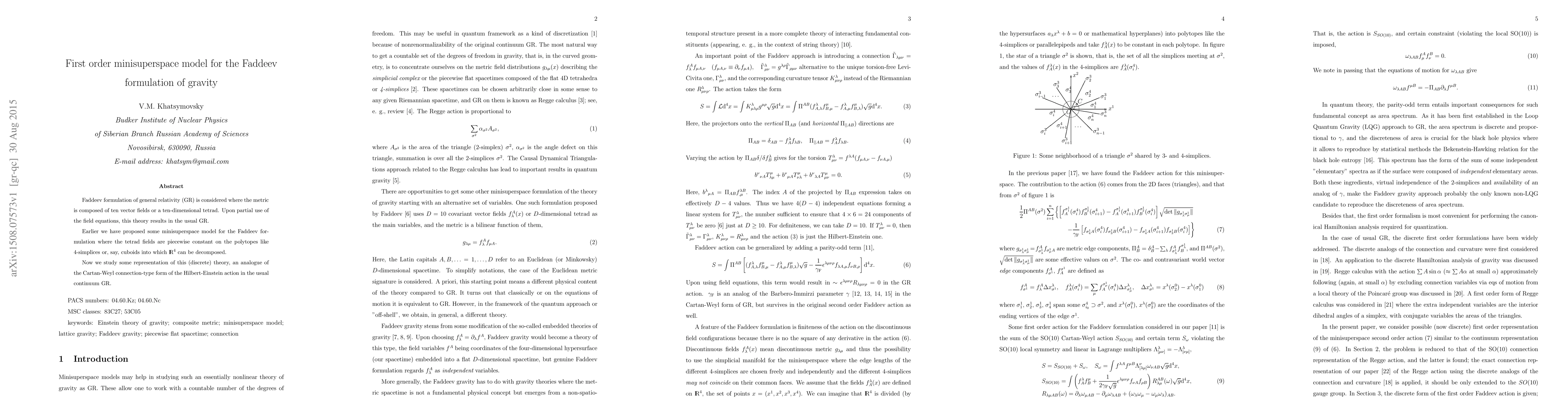 This paper explores the first order minisuperspace model for the Faddeev formulation of gravity, proposing a discrete representation of the theory using piecewise constant tetrad fields on 4-simplices or cuboids, and aims to parallel the Cartan-Weyl connection-type form of the Hilbert-Einstein action in continuum general relativity.