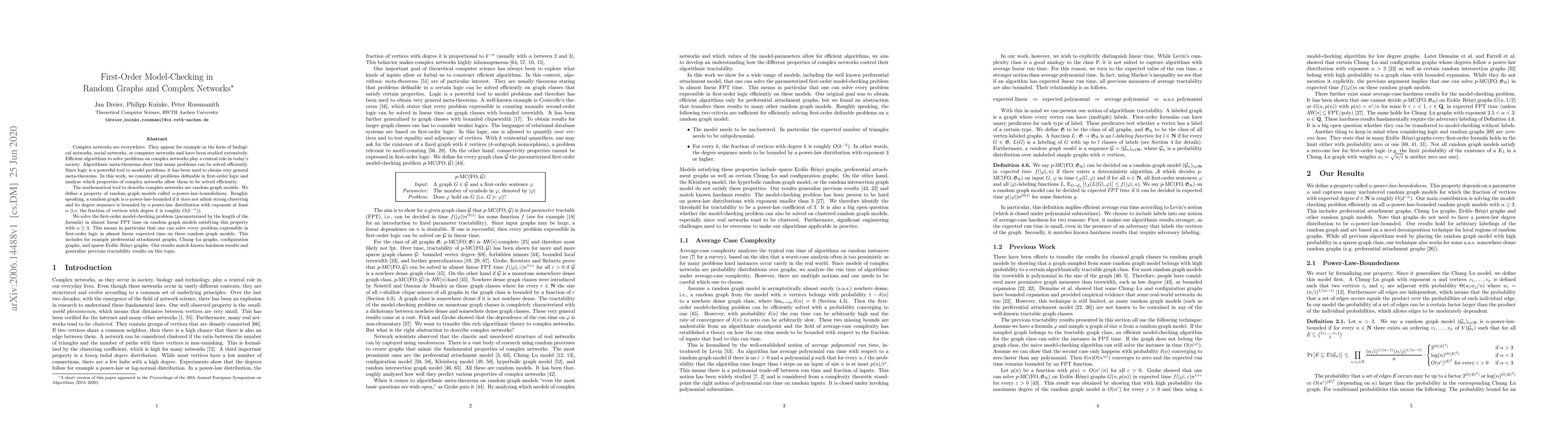 Complex networks are everywhere. They appear for example in the form of biological networks, social networks, or computer networks and have been studied extensively. Efficient algorithms to solve problems on complex networks play a central role in today's society. Algorithmic meta-theorems show that many problems can be solved efficiently. Since logic is a powerful tool to model problems, it has been used to obtain very general meta-theorems. In this work, we consider all problems definable in first-order logic and analyze which properties of complex networks allow them to be solved efficiently. The mathematical tool to describe complex networks are random graph models. We define a property of random graph models called $\alpha$-power-law-boundedness. Roughly speaking, a random graph is $\alpha$-power-law-bounded if it does not admit strong clustering and its degree sequence is bounded by a power-law distribution with exponent at least $\alpha$ (i.e. the fraction of vertices with degree $k$ is roughly $O(k^{-\alpha})$). We solve the first-order model-checking problem (parameterized by the length of the formula) in almost linear FPT time on random graph models satisfying this property with $\alpha \ge 3$. This means in particular that one can solve every problem expressible in first-order logic in almost linear expected time on these random graph models. This includes for example preferential attachment graphs, Chung-Lu graphs, configuration graphs, and sparse Erd\H{o}s-R\'{e}nyi graphs. Our results match known hardness results and generalize previous tractability results on this topic.