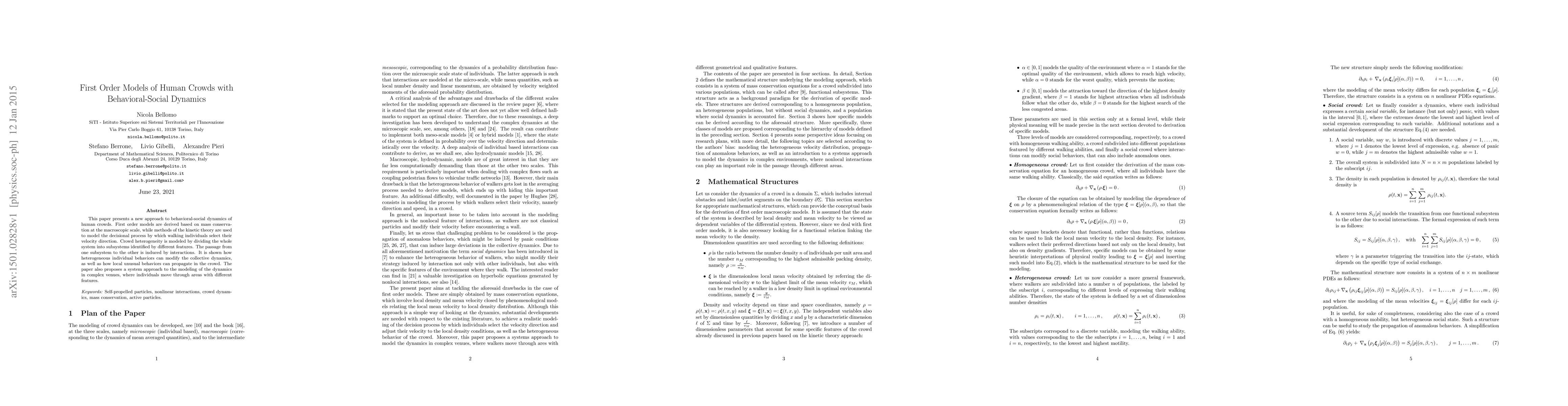 This paper introduces first order models for human crowd dynamics based on mass conservation and kinetic theory, capturing the decision-making processes of individuals and modeling crowd heterogeneity through subsystem interactions. It demonstrates how individual behaviors influence collective dynamics and propagates unusual behaviors within the crowd.