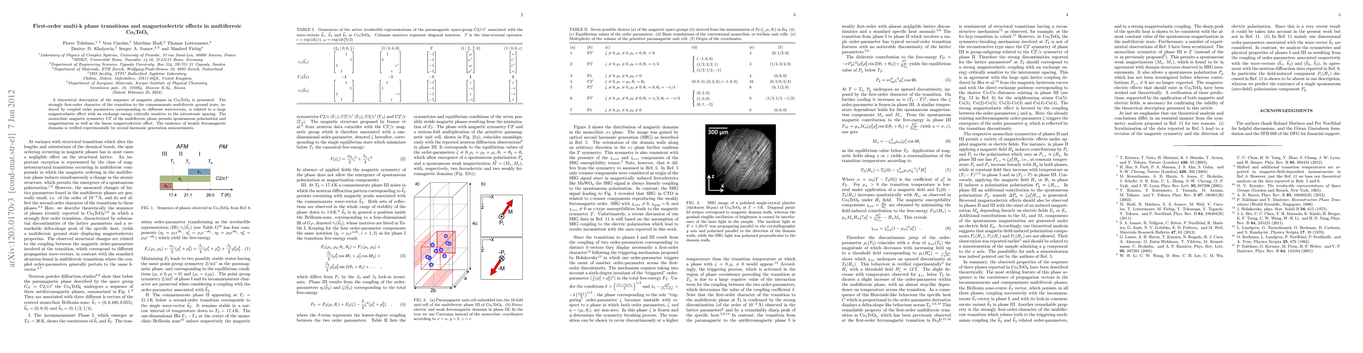 Researchers describe a new multiferroic material Co3TeO6 that exhibits strong first-order phase transitions and magnetoelectric effects, with spontaneous polarization and magnetization due to its monoclinic magnetic symmetry.