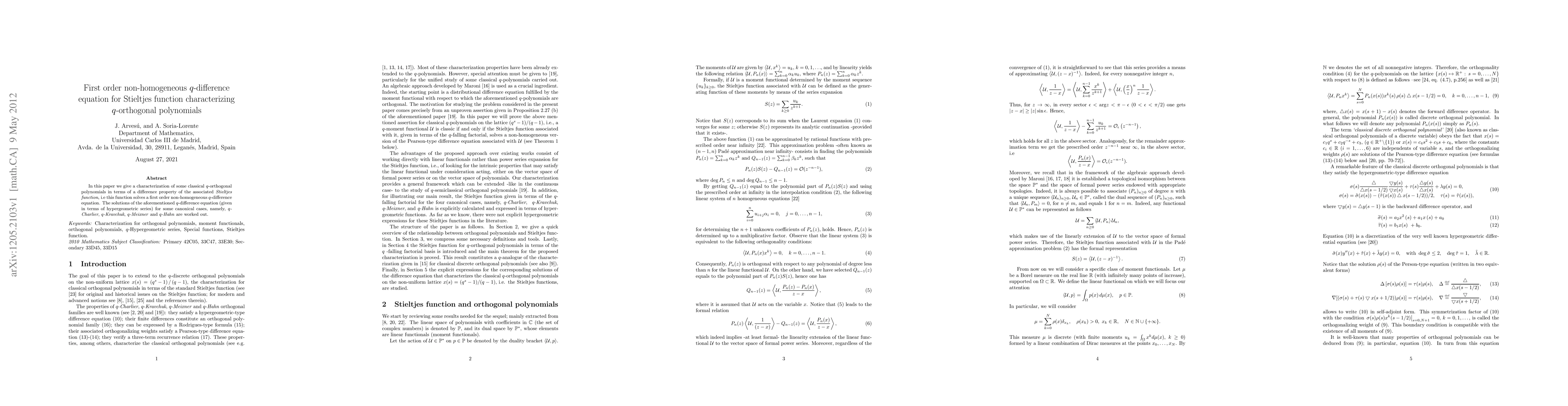 This paper characterizes classical q-orthogonal polynomials through a first order non-homogeneous q-difference equation for the associated Stieltjes function, providing solutions in terms of hypergeometric series for q-Charlier, q-Kravchuk, q-Meixner, and q-Hahn polynomials.