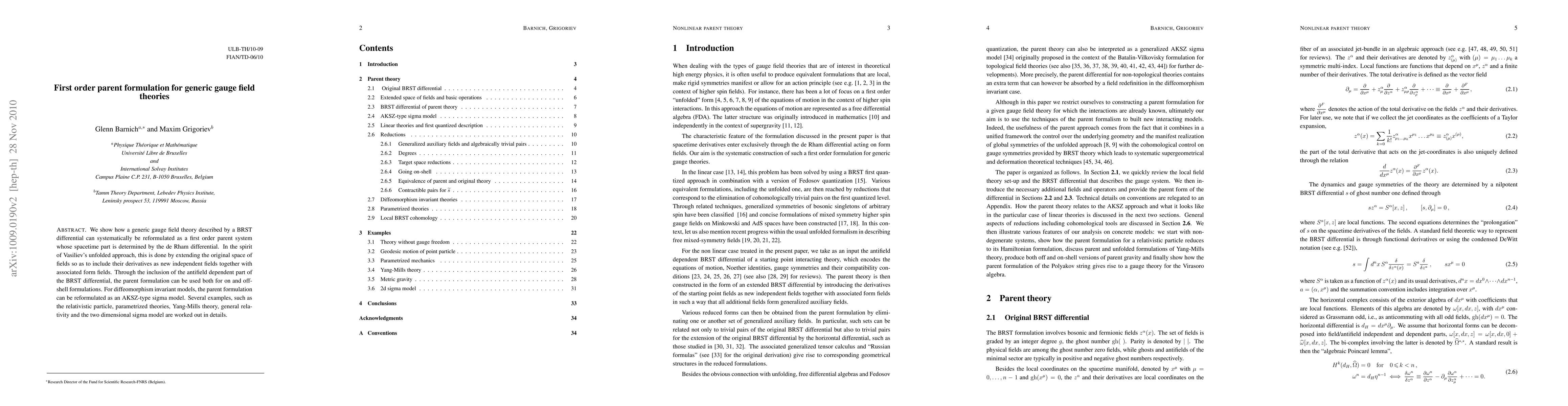 This paper reformulates generic gauge field theories using a first-order parent system based on the BRST differential, extending the field space to include derivatives as new independent fields. This approach allows for both on- and off-shell formulations, exemplified through models like Yang-Mills theory and general relativity.