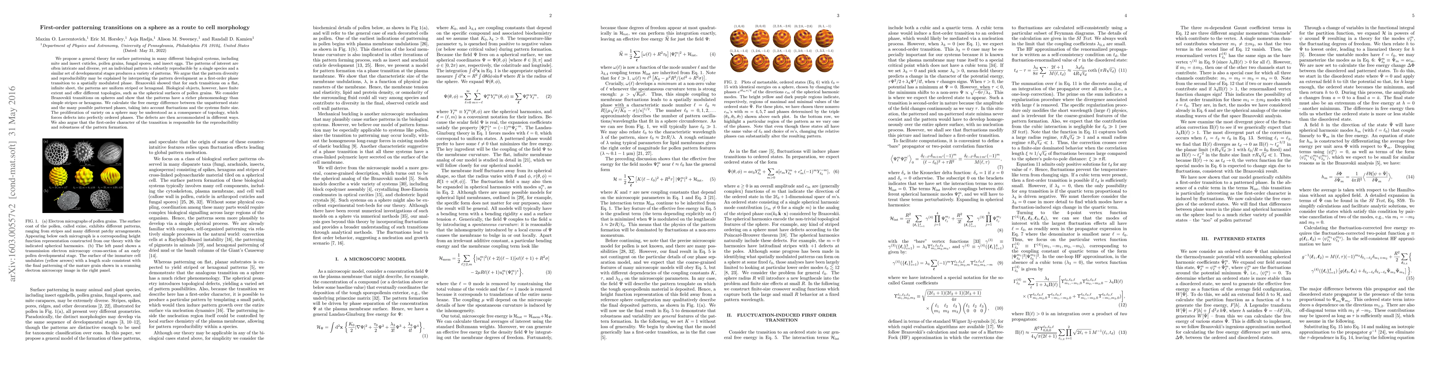 Researchers propose a theory explaining how intricate patterns on biological surfaces, like those found on pollen grains and insect eggs, emerge through a first-order phase transition on spherical surfaces. This transition allows for pattern diversity and reproducibility due to the system's finite size and topology.