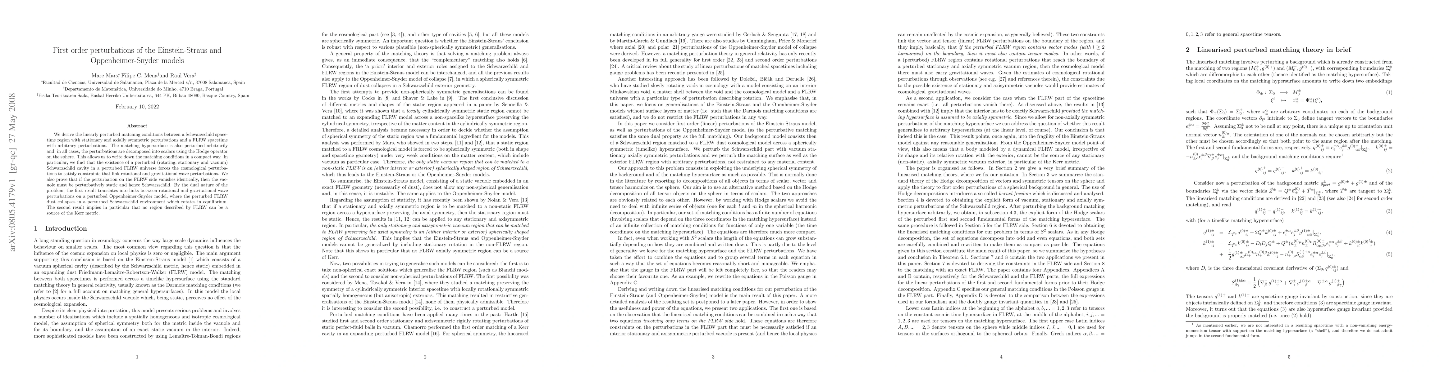 We derive the linearly perturbed matching conditions between a Schwarzschild spacetime region with stationary and axially symmetric perturbations and a FLRW spacetime with arbitrary perturbations. The matching hypersurface is also perturbed arbitrarily and, in all cases, the perturbations are decomposed into scalars using the Hodge operator on the sphere. This allows us to write down the matching conditions in a compact way. In particular, we find that the existence of a perturbed (rotating, stationary and vacuum) Schwarzschild cavity in a perturbed FLRW universe forces the cosmological perturbations to satisfy constraints that link rotational and gravitational wave perturbations. We also prove that if the perturbation on the FLRW side vanishes identically, then the vacuole must be perturbatively static and hence Schwarzschild. By the dual nature of the problem, the first result translates into links between rotational and gravitational wave perturbations on a perturbed Oppenheimer-Snyder model, where the perturbed FLRW dust collapses in a perturbed Schwarzschild environment which rotates in equilibrium. The second result implies in particular that no region described by FLRW can be a source of the Kerr metric.