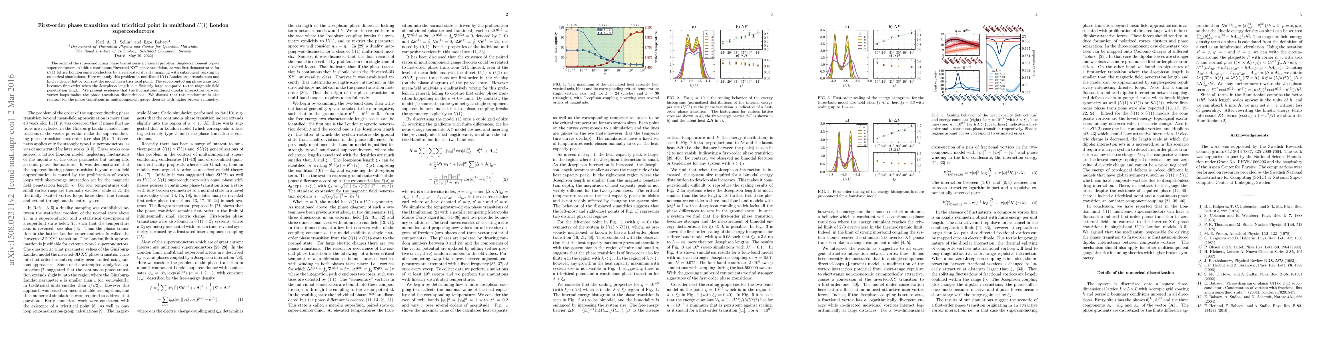 The order of the superconducting phase transition is a classical problem. Single-component type-2 superconductors exhibit a continuous "inverted-XY" phase transition, as was first demonstrated for U(1) lattice London superconductors by a celebrated duality mapping with subsequent backing by numerical simulations. Here we study this problem in multiband U(1) London superconductors and find evidence that by contrast the model has a tricritical point. The superconducting phase transition becomes first-order when the Josephson length is sufficiently large compared to the magnetic field penetration length. We present evidence that the fluctuation-induced dipolar interaction between vortex loops makes the phase transition discontinuous. We discuss that this mechanism is also relevant for the phase transitions in multicomponent gauge theories with higher broken symmetry.