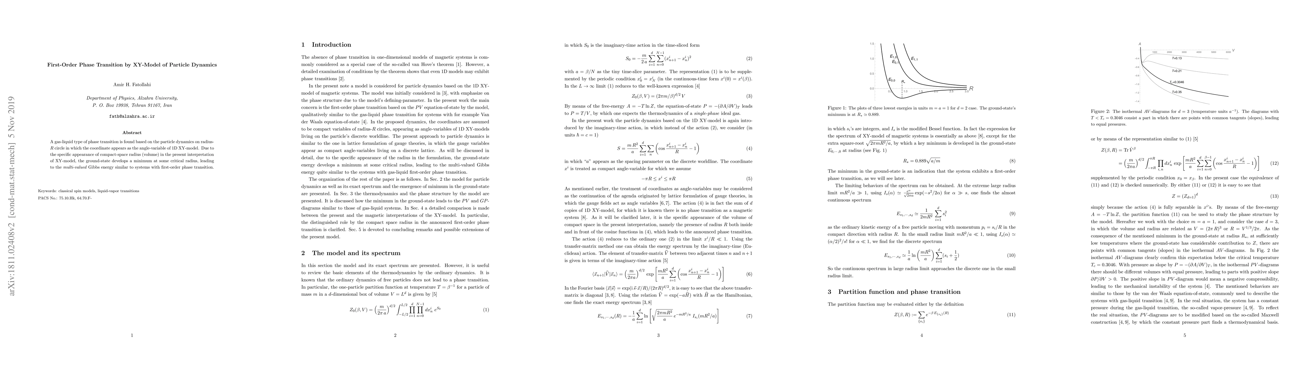 This paper explores a gas-liquid phase transition in a particle dynamics model on a radius-$R$ circle, revealing a first-order transition akin to systems with multi-valued Gibbs energy. The unique compact-space radius in the XY-model's interpretation causes a critical radius where the ground state develops a minimum.