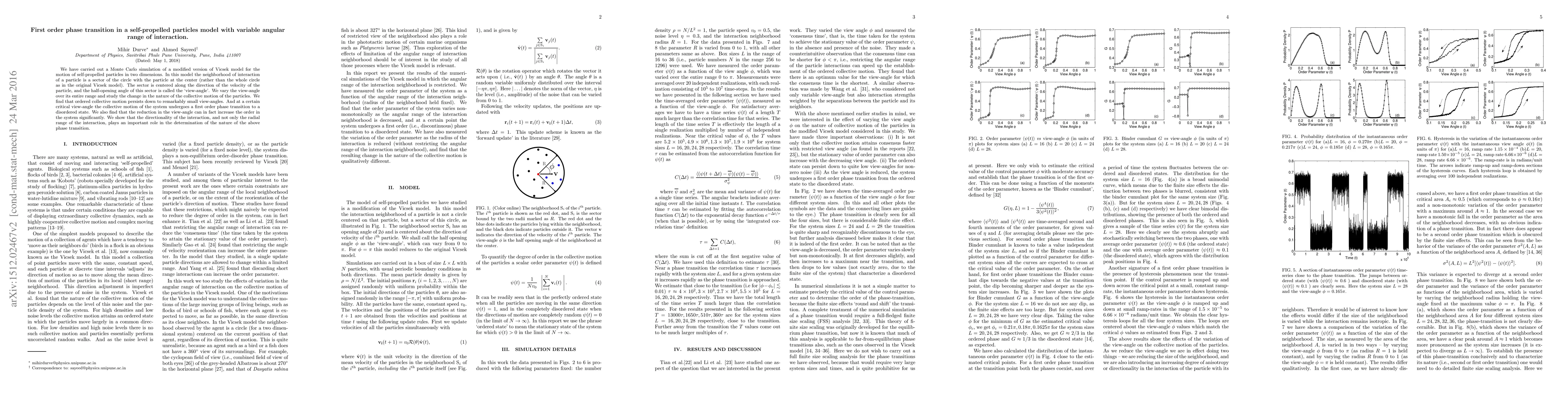 We have carried out a Monte Carlo simulation of a modified version of Vicsek model for the motion of self-propelled particles in two dimensions. In this model the neighborhood of interaction of a particle is a sector of the circle with the particle at the center (rather than the whole circle as in the original Vicsek model). The sector is centered along the direction of the velocity of the particle, and the half-opening angle of this sector is called the `view-angle'. We vary the view-angle over its entire range and study the change in the nature of the collective motion of the particles. We find that ordered collective motion persists down to remarkably small view-angles. And at a certain critical view-angle the collective motion of the system undergoes a first order phase transition to a disordered state. We also find that the reduction in the view-angle can in fact increase the order in the system significantly. We show that the directionality of the interaction, and not only the radial range of the interaction, plays an important role in the determination of the nature of the above phase transition.
