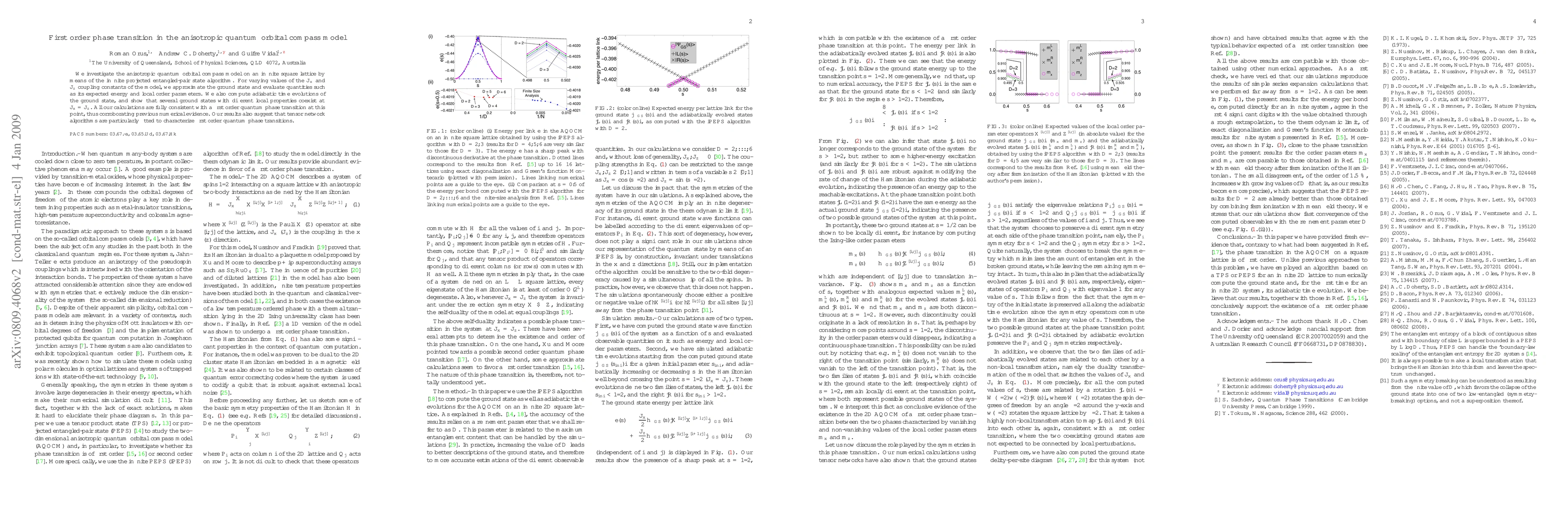 We investigate the anisotropic quantum orbital compass model on an infinite square lattice by means of the infinite projected entangled-pair state algorithm. For varying values of the $J_x$ and $J_z$ coupling constants of the model, we approximate the ground state and evaluate quantities such as its expected energy and local order parameters. We also compute adiabatic time evolutions of the ground state, and show that several ground states with different local properties coexist at $J_x = J_z$. All our calculations are fully consistent with a first order quantum phase transition at this point, thus corroborating previous numerical evidence. Our results also suggest that tensor network algorithms are particularly fitted to characterize first order quantum phase transitions.