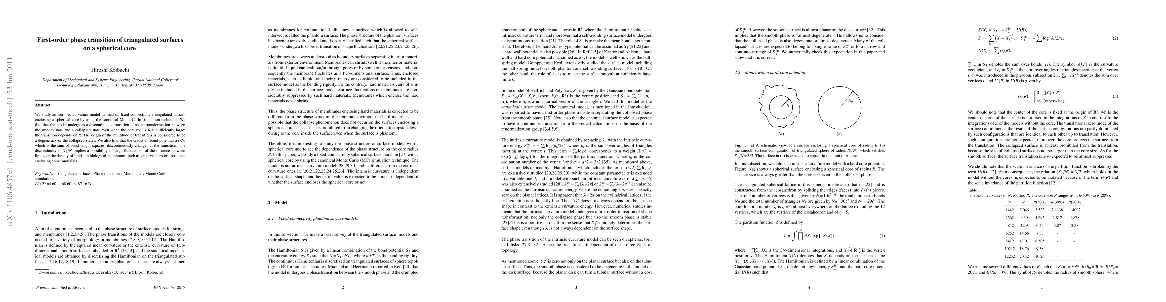 We study an intrinsic curvature model defined on fixed-connectivity triangulated lattices enclosing a spherical core by using the canonical Monte Carlo simulation technique. We find that the model undergoes a discontinuous transition of shape transformation between the smooth state and a collapsed state even when the core radius $R$ is sufficiently large; the transition depends on $R$. The origin of the multitude of transitions is considered to be a degeneracy of the collapsed states. We also find that the Gaussian bond potential $S_1/N$, which is the sum of bond length squares, discontinuously changes at the transition. The discontinuity in $S_1/N$ implies a possibility of large fluctuations of the distance between lipids, or the density of lipids, in biological membranes such as giant vesicles or liposomes enclosing some materials.