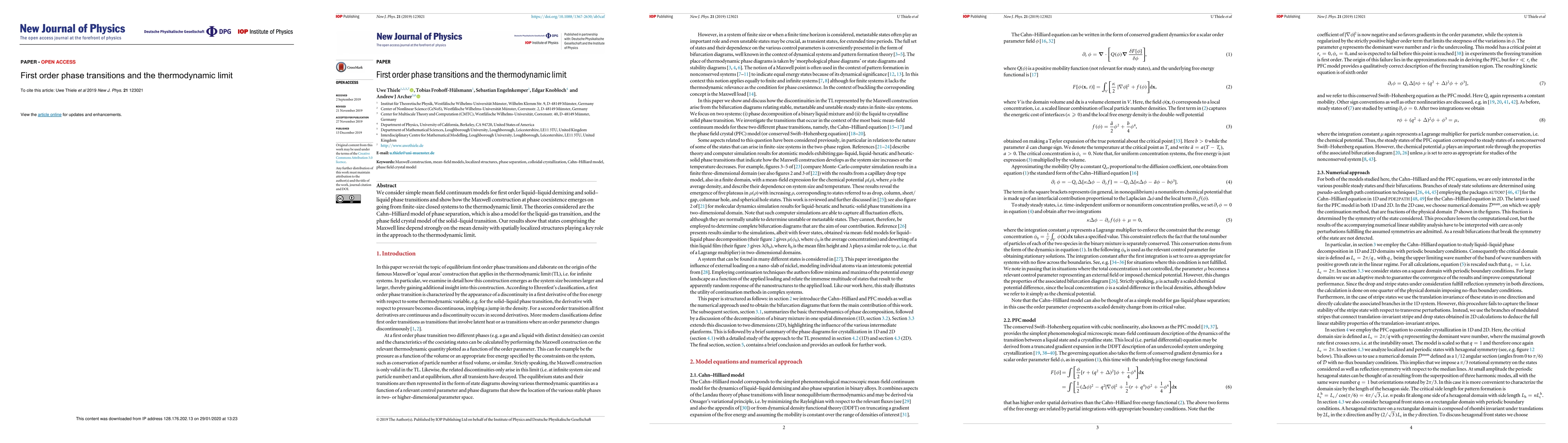 We consider simple mean field continuum models for first order liquid-liquid demixing and solid-liquid phase transitions and show how the Maxwell construction at phase coexistence emerges on going from finite-size closed systems to the thermodynamic limit. The theories considered are the Cahn-Hilliard model of phase separation, which is also a model for the liquid-gas transition, and the phase field crystal model of the solid-liquid transition. Our results show that states comprising the Maxwell line depend strongly on the mean density with spatially localized structures playing a key role in the approach to the thermodynamic limit.