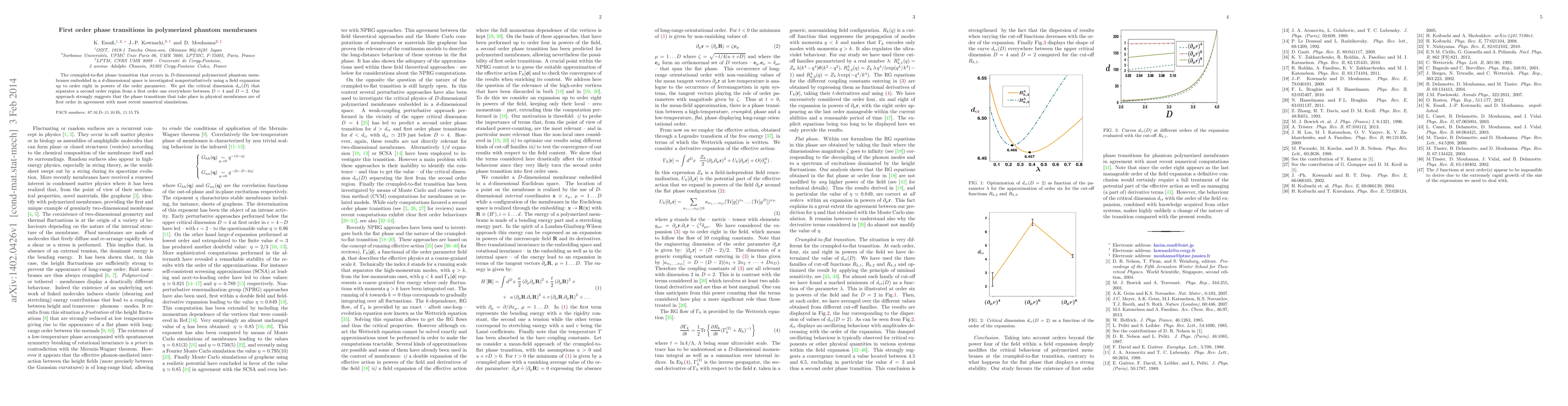 The crumpled-to-flat phase transition that occurs in D-dimensional polymerized phantom membranes embedded in a d-dimensional space is investigated nonperturbatively using a field expansion up to order eight in powers of the order parameter. We get the critical dimension dcr(D) that separates a second order region from a first order one everywhere between D=4 and D=2. Our approach strongly suggests that the phase transitions that take place in physical membranes are of first order in agreement with most recent numerical simulations.
