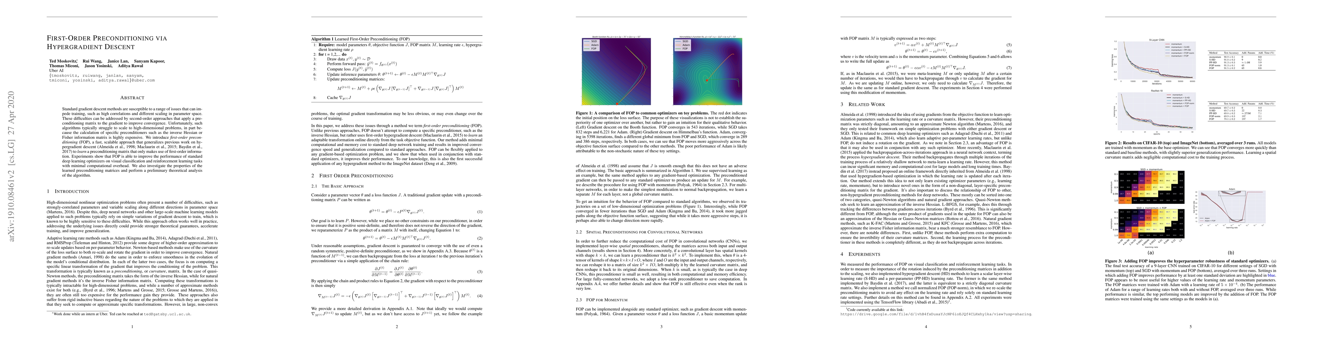 Standard gradient descent methods are susceptible to a range of issues that can impede training, such as high correlations and different scaling in parameter space.These difficulties can be addressed by second-order approaches that apply a pre-conditioning matrix to the gradient to improve convergence. Unfortunately, such algorithms typically struggle to scale to high-dimensional problems, in part because the calculation of specific preconditioners such as the inverse Hessian or Fisher information matrix is highly expensive. We introduce first-order preconditioning (FOP), a fast, scalable approach that generalizes previous work on hypergradient descent (Almeida et al., 1998; Maclaurin et al., 2015; Baydin et al.,2017) to learn a preconditioning matrix that only makes use of first-order information. Experiments show that FOP is able to improve the performance of standard deep learning optimizers on visual classification and reinforcement learning tasks with minimal computational overhead. We also investigate the properties of the learned preconditioning matrices and perform a preliminary theoretical analysis of the algorithm.