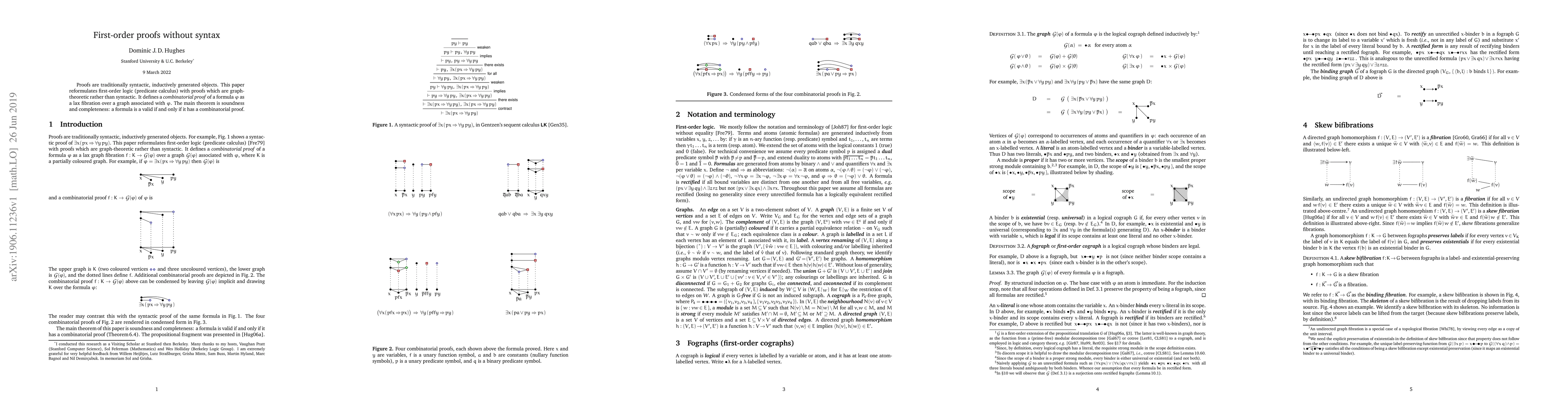 This paper reformulates first-order logic using graph-theoretic proofs instead of traditional syntactic proofs, defining a combinatorial proof as a lax fibration over a formula's graph. The main result establishes the soundness and completeness of this new proof system.