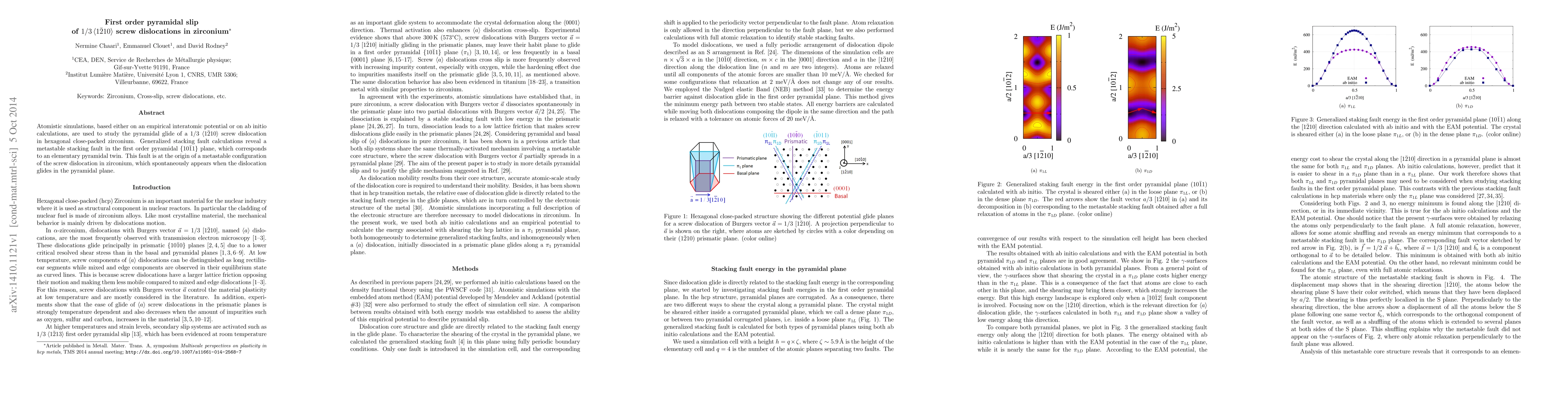 Two-line summary: Atomistic simulations show that a 1/3 <1-210> screw dislocation in zirconium exhibits first order pyramidal slip in the {10-11} plane, leading to a metastable stacking fault and an elementary pyramidal twin configuration during glide.