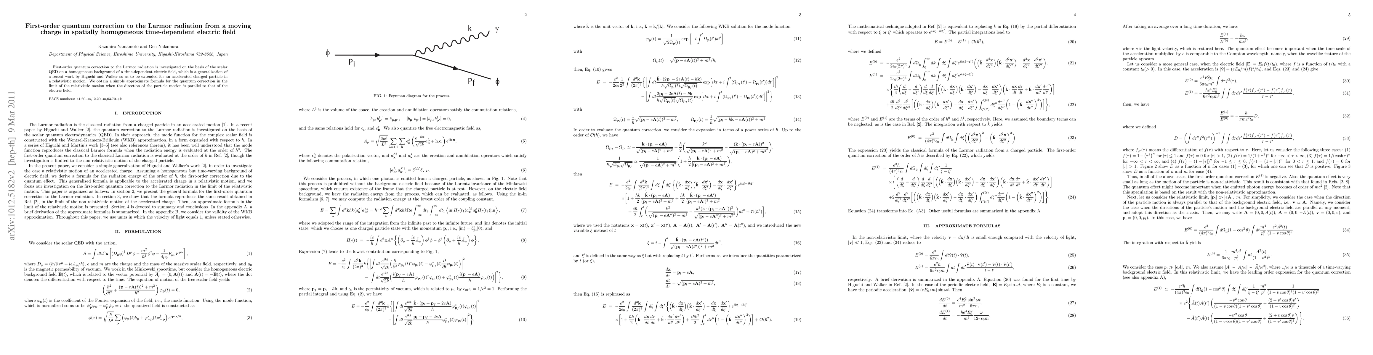First-order quantum correction to the Larmor radiation is investigated on the basis of the scalar QED on a homogeneous background of time-dependent electric field, which is a generalization of a recent work by Higuchi and Walker so as to be extended for an accelerated charged particle in a relativistic motion. We obtain a simple approximate formula for the quantum correction in the limit of the relativistic motion when the direction of the particle motion is parallel to that of the electric field.