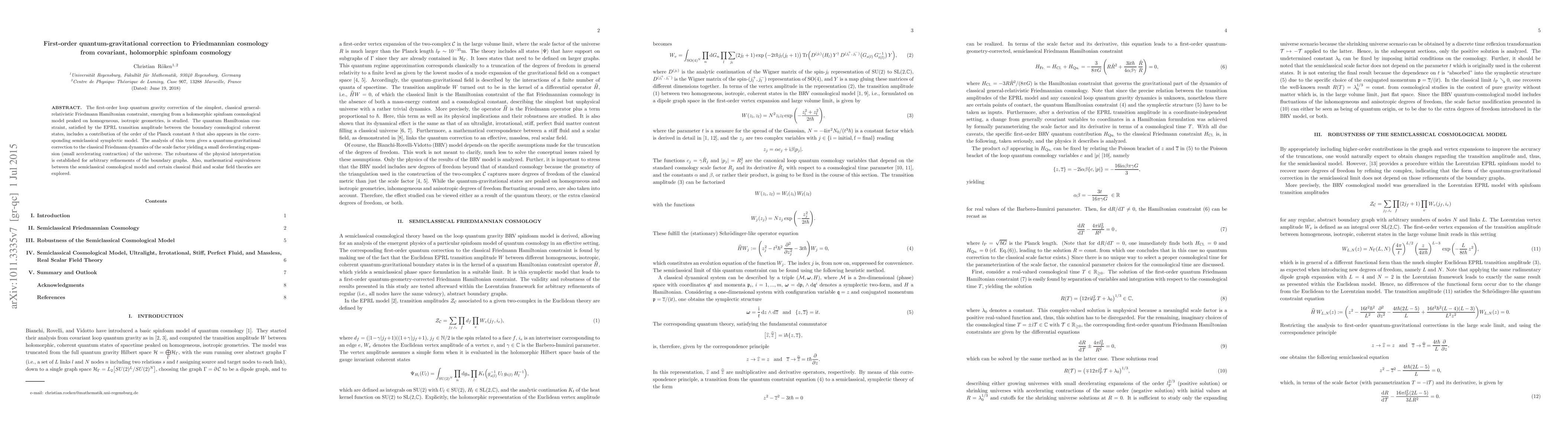 The first-order loop quantum gravity correction of the simplest, classical general-relativistic Friedmann Hamiltonian constraint, emerging from a holomorphic spinfoam cosmological model peaked on homogeneous, isotropic geometries, is studied. The quantum Hamiltonian constraint, satisfied by the EPRL transition amplitude between the boundary cosmological coherent states, includes a contribution of the order of the Planck constant $\hbar$ that also appears in the corresponding semiclassical symplectic model. The analysis of this term gives a quantum-gravitational correction to the classical Friedmann dynamics of the scale factor yielding a small decelerating expansion (small accelerating contraction) of the universe. The robustness of the physical interpretation is established for arbitrary refinements of the boundary graphs. Also, mathematical equivalences between the semiclassical cosmological model and certain classical fluid and scalar field theories are explored.