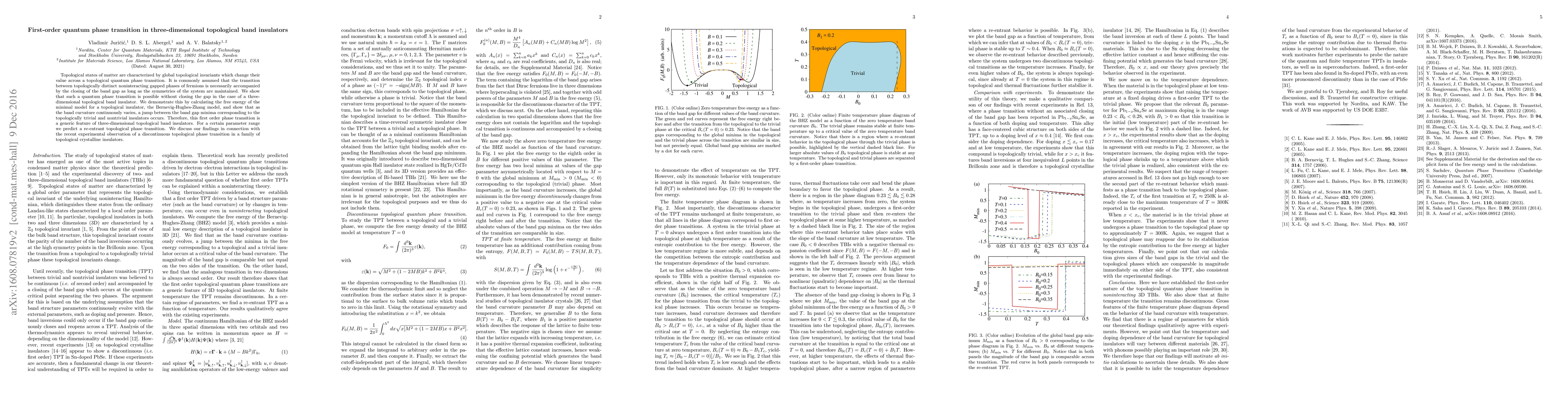This paper demonstrates a first-order quantum phase transition in three-dimensional topological band insulators without closing the band gap, using the Bernevig-Hughes-Zhang model. It predicts a re-entrant topological phase transition and connects these findings to recent experimental observations in topological crystalline insulators.