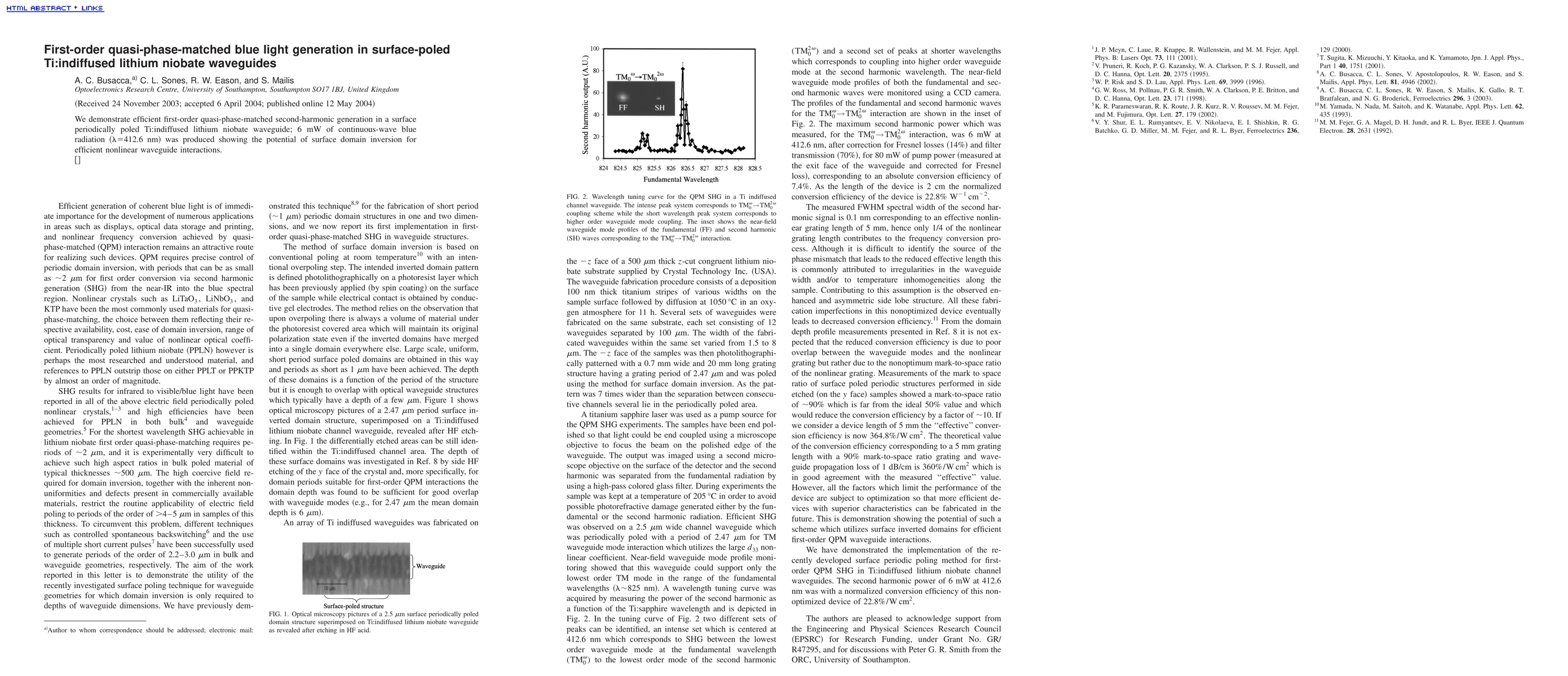 This research demonstrates efficient first-order quasi-phase-matched second-harmonic generation in surface-poled Ti:indiffused lithium niobate waveguides, producing 6 mW of continuous-wave blue light at 412.6 nm, highlighting the potential of surface domain inversion for effective nonlinear optical processes.