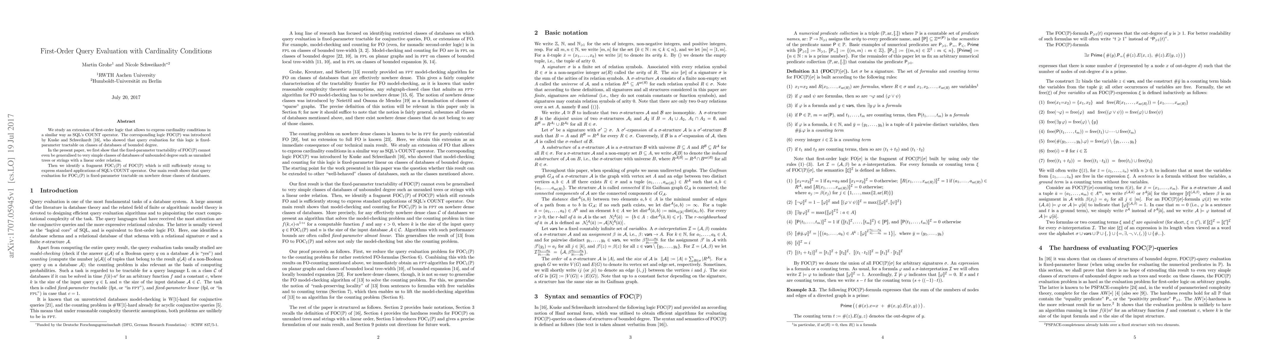This paper extends first-order logic to express cardinality conditions akin to SQL's COUNT operator, introducing FOC(P). It shows that FOC(P) lacks fixed-parameter tractability for simple classes of unbounded degree structures. However, a fragment FOC1(P) maintains sufficient expressiveness and achieves fixed-parameter tractability with almost linear running time on nowhere dense classes.