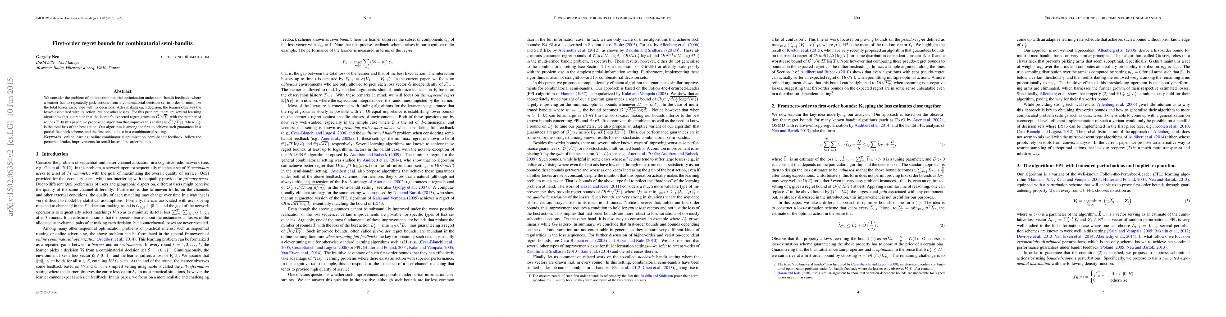We consider the problem of online combinatorial optimization under semi-bandit feedback, where a learner has to repeatedly pick actions from a combinatorial decision set in order to minimize the total losses associated with its decisions. After making each decision, the learner observes the losses associated with its action, but not other losses. For this problem, there are several learning algorithms that guarantee that the learner's expected regret grows as $\widetilde{O}(\sqrt{T})$ with the number of rounds $T$. In this paper, we propose an algorithm that improves this scaling to $\widetilde{O}(\sqrt{{L_T^*}})$, where $L_T^*$ is the total loss of the best action. Our algorithm is among the first to achieve such guarantees in a partial-feedback scheme, and the first one to do so in a combinatorial setting.